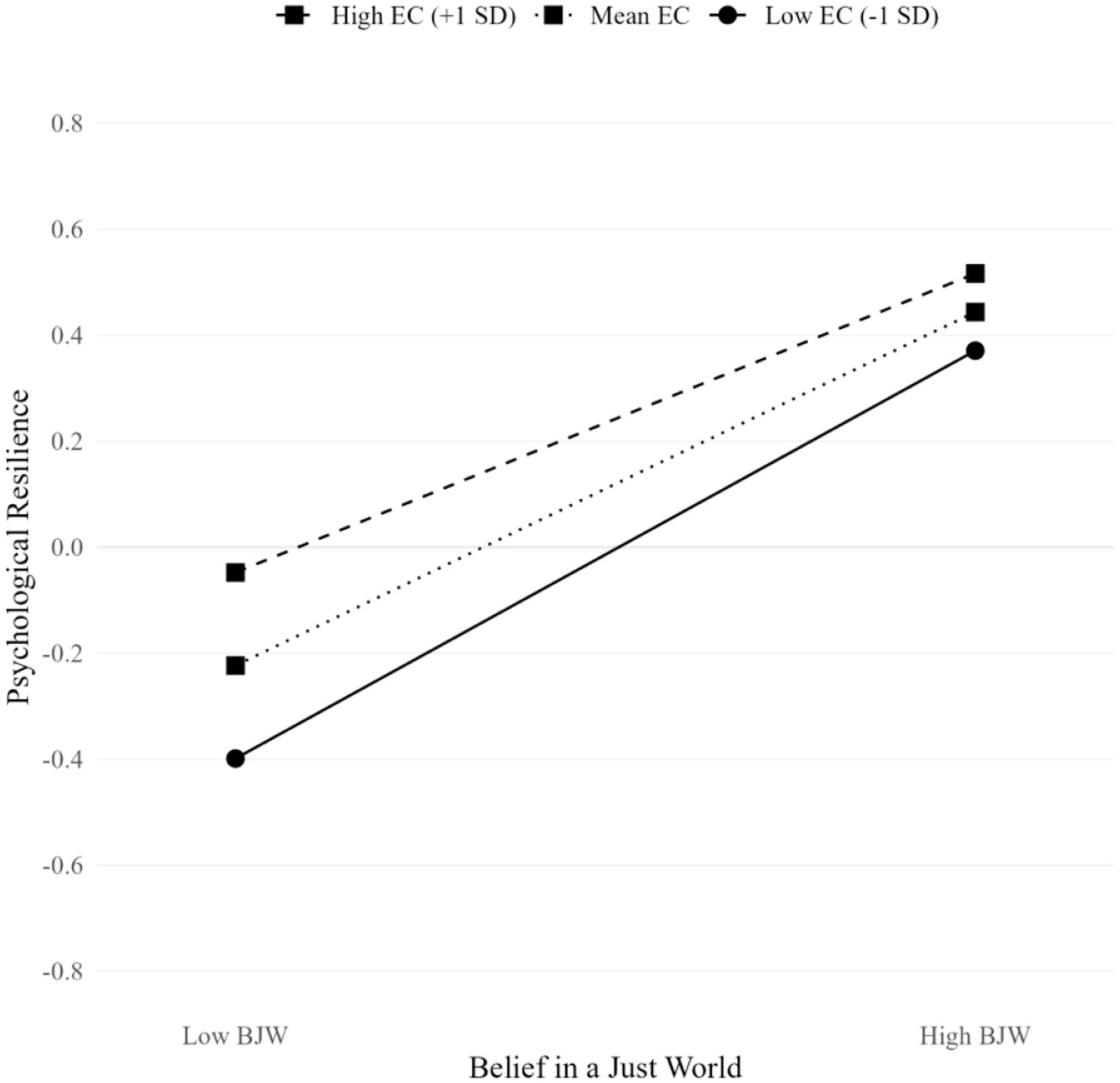 The resource dynamics in this model operate differently across EC levels. For individuals with lower EC, the BJW-PR-PBT pathway represents what Hobfoll et al. (2018) terms a “focused resource channel,” where belief resources must be converted to resilience resources through more direct but potentially less efficient pathways. Conversely, individuals with higher EC possess what COR theory describes as “resource redundancy” (Winterich et al., 2013), allowing them to access multiple pathways for converting beliefs into resilience resources.