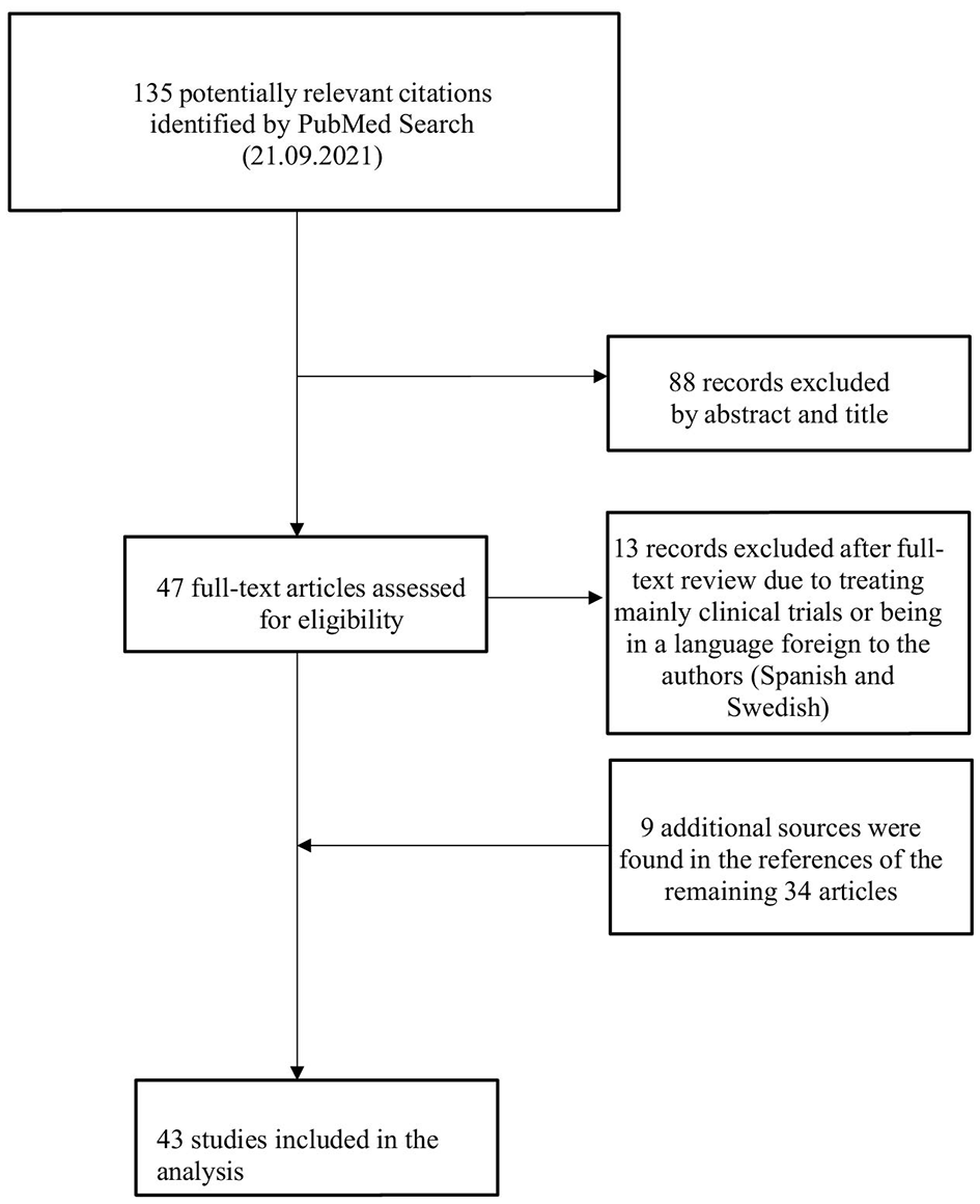 First, hard laws were identified in official legal documents via a thorough review of information from regulatory bodies available online. Second, to understand the current guidelines governing the use of placebos we conducted a literature search focusing on scientific publications related to the legislative aspects of placebo use. To find relevant articles, the search-string (placebo[tiab]) AND [(law[tiab]) OR (legal[tiab])] NOT [(randomized controlled trial) OR (trial)] was used on PubMed. After closer investigation of the 89 articles found, a final selection resulted in 13 relevant titles being included. A flowchart of the search process is presented in Figure 1. Additionally, we analyzed health institution websites for guidelines, codes of conduct, or recommendations on placebo use, focusing on their ethical and moral value in clinical practice. Since laws pertaining to medical care and codes of conduct for healthcare professionals are inherently linked to ethics, a second search on PubMed was conducted to find information about the ethical aspects of placebos in clinical practice. The search string used was [(placebo[tiab]) AND (ethics[tiab])] NOT [(randomized controlled trial) OR (trial)]. One hundred and thirty-five citations were found to match this time. Out of 135 citations identified, 88 were excluded based on abstracts and titles. Of the 47 full-text articles assessed, 13 were excluded for focusing on clinical trials or being in foreign languages. Nine additional sources were identified from the references of the remaining 34 articles, resulting in 43 studies included in the analysis. Figure 2 shows a flowchart of the search procedure.