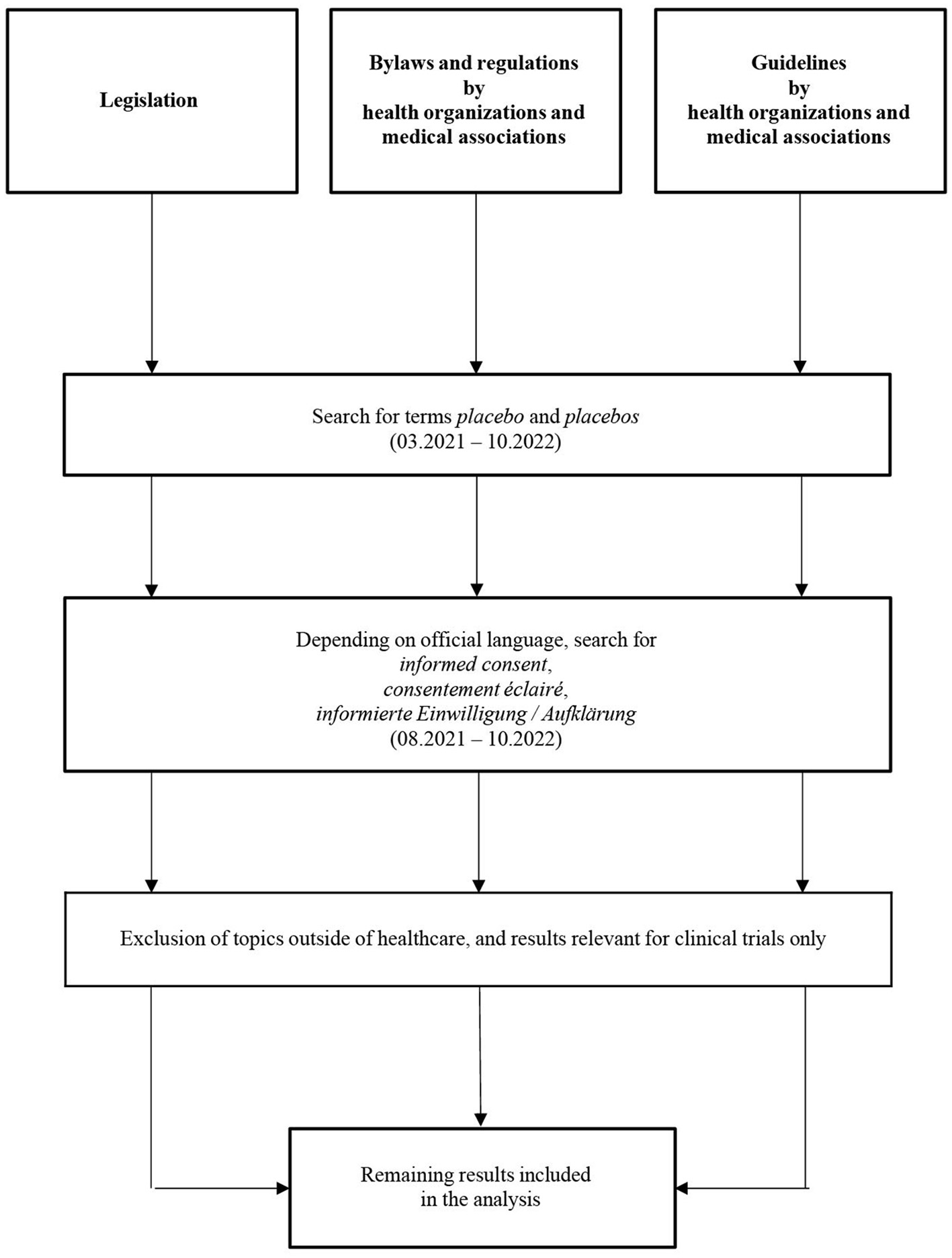 Finally, the search process's parameters were expanded to more widely encompass laws pertaining to patients' rights and physicians' obligations to inform patients. For this purpose, the same sources that were used for laws, ethical standards, and guidelines for placebos were examined. However, this time, the search phrases informed consent, consentement éclairé, or informierte Einwilligung/Aufklärung were used, depending on official language and expressing the same idea, respectively. A flow chart of the search strategy is presented in Figure 3.