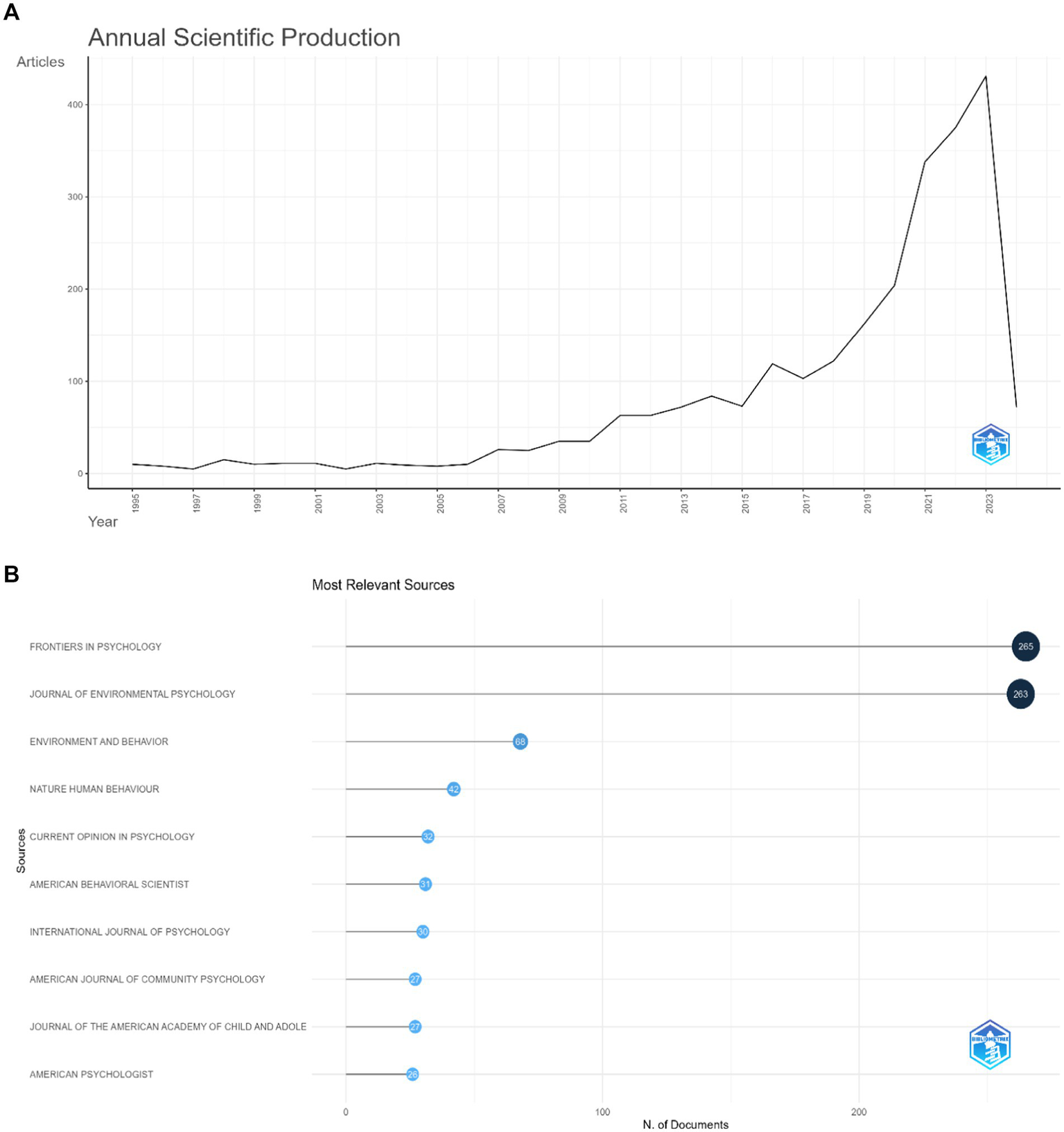 The data on the most locally cited sources reveal the central position of “Journal of Environmental Psychology” within the academic community, amassing 4,103 local citations (Figure 3B). The citation frequency of this journal not only reflects its contributions to the field. High citation counts are often associated with journals that have not only a substantial H-index but also a significant impact factor. Furthermore, when examining citation patterns, the data indicates that the “Journal of Environmental Psychology” holds a prominent position in terms of local citations, suggesting its considerable influence within the field. This might be due to its longer establishment, since 1981.
