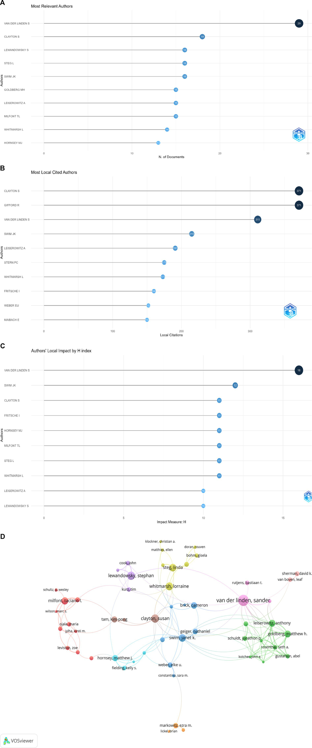 Figure 4D is network visualization from a bibliometric tool VOSviewer, displaying the co-authorship network among authors. The size of the nodes corresponds to the number of documents. The lines between the nodes indicate co-authorship. The different colors can represent different clusters or research groups, possibly highlighting the authors’ focus areas or collaborative patterns. The central figures, such as van der Linden and Clayton, are likely key influencers in their networks, as indicated by their larger node size and numerous connections. These visualizations provide insight into the impact and productivity of authors in a specific research area. By analyzing the number of documents, citations, H-index, and collaborative networks, we can infer the central figures within the field and identify potential collaboration opportunities.