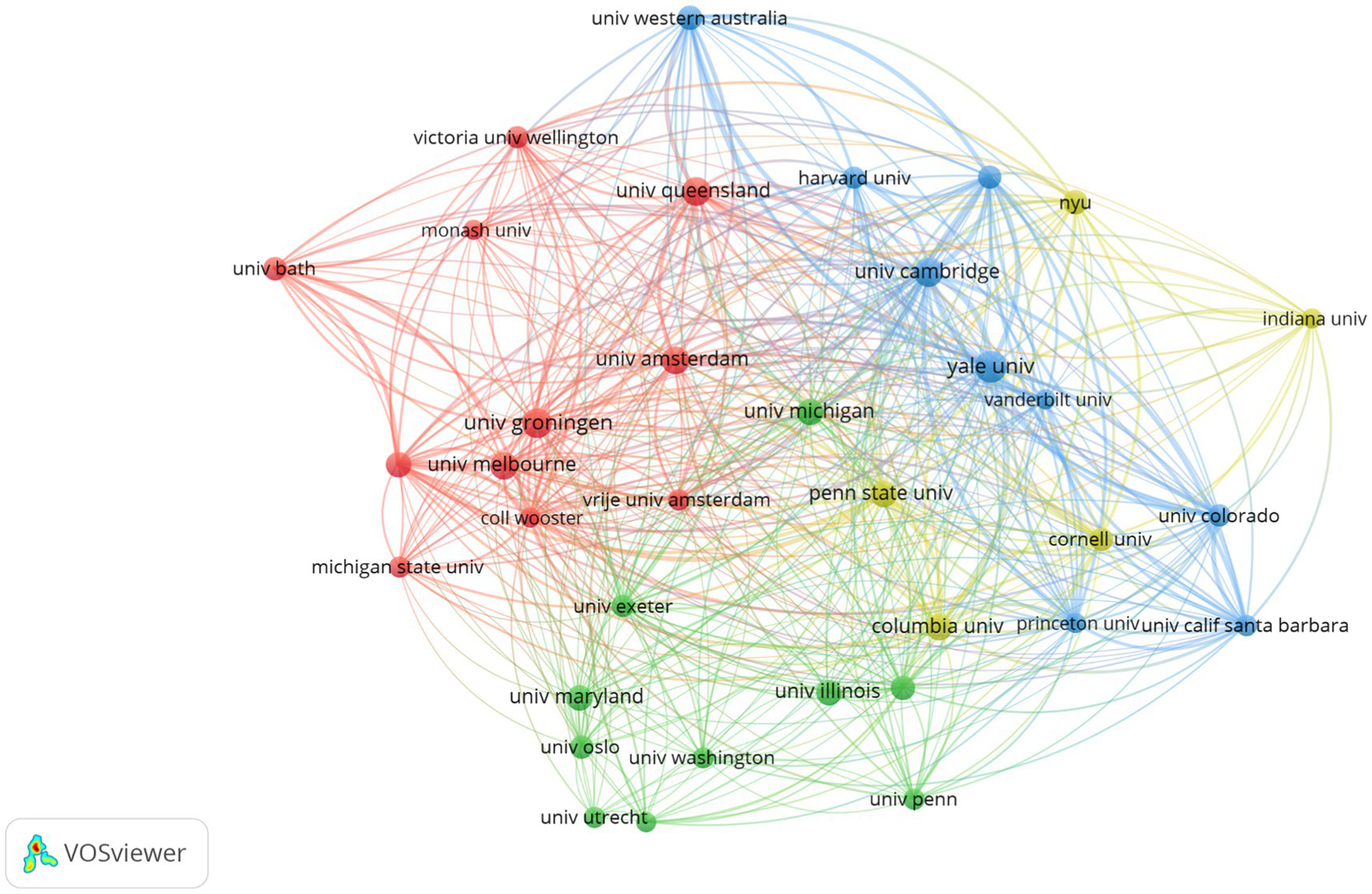 Based on the network visualization provided, which is a bibliometric analysis of universities in a specific research context we can observe the visualization shown in Figure 5. It shows clusters of universities, grouped by research collaboration. There is a noticeable cluster involving the University of Melbourne, Griffith University, and other Australian universities, indicating a strong regional collaboration network. There are numerous interlinking lines that suggest cross-institutional collaborations or citations. The density and centrality of these connections can signal the extent to which research from these institutions is interwoven within the global academic community. The presence of universities from various parts of the world suggests a global network of research activities. For instance, we can see representation from North America, Europe, Asia, and Australia, indicating the international scope of research in the field. This type of network visualization helps to identify key research institutions and understand the collaborative dynamics within a specific academic field. It can be particularly useful for new researchers looking to find potential institutions for collaboration or for established researchers aiming to understand the impact and reach of their work.