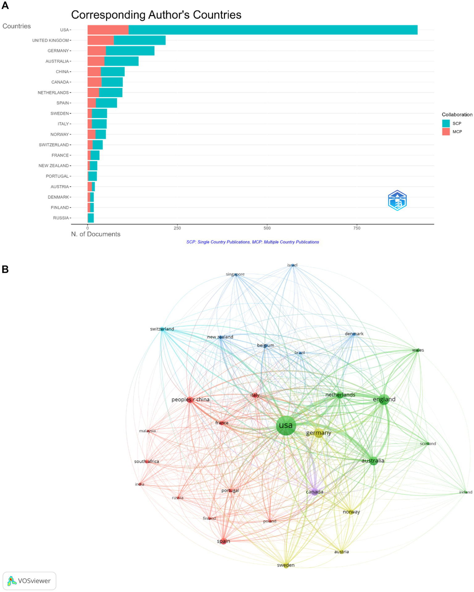 Figure 6A is a horizontal bar graph depicting the distribution of scientific documents by corresponding authors’ countries, classified by the type of collaboration: single country publications (SCP) and multiple country publications (MCP). The x-axis represents the number of documents, while the y-axis lists various countries. The USA leads substantially in both SCP and MCP, indicating a high level of both domestic and international collaborative research. The United Kingdom follows, with a significant number of SCPs and a relatively high number of MCPs, suggesting strong international collaborations as well. Germany, Australia, and China also show considerable numbers in both categories, underscoring their active roles in both national and international research arenas. Countries like Canada, the Netherlands, and Spain are also prominent on the list with both SCP and MCP, illustrating robust research environments within these countries in the Global North, both in domestic research and cross-border partnerships with each other. Figure 6A also shows that Sweden, Italy, Norway, and Switzerland have fewer documents but maintain a presence in international collaborations. France, New Zealand, and Portugal have a lower number of documents, with SCPs being more prevalent than MCPs, implying a stronger focus on national research efforts. Austria, Denmark, Finland, and Russia round out the list, with a smaller presence in the graph, indicating lesser but still significant academic contributions within this context. The figure suggests that the USA is the most prolific contributor to the field of study in question, followed by the UK and Germany. There is also a notable amount of international collaboration across most of the featured countries, as shown by the presence of MCPs.