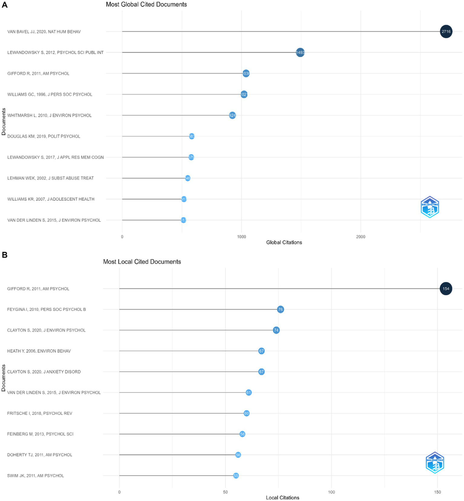 Figure 2B presents the top 10 most popular journals contributing to articles on climate change and psychological topics. Frontiers in Psychology was the leading journal, publishing the most papers (265 articles), followed by Journal of Environmental Psychology (263 articles), Environment and Behavior (68 articles), Nature Human Behavior (42 articles), Current Opinions in Psychology (32 articles,), American Behavioral Scientist (31 articles), International Journal of Psychology (31 articles), American Journal of Community Psychology (27 articles), Journal of American Academy of Child and Adolescents (27 articles, England), American Psychologist (26 articles). The graphs indicate trends in producing scholarly literature and citation practices over time, which is essential for understanding the development of research areas and their relative influence or impact within psychology as a field.
