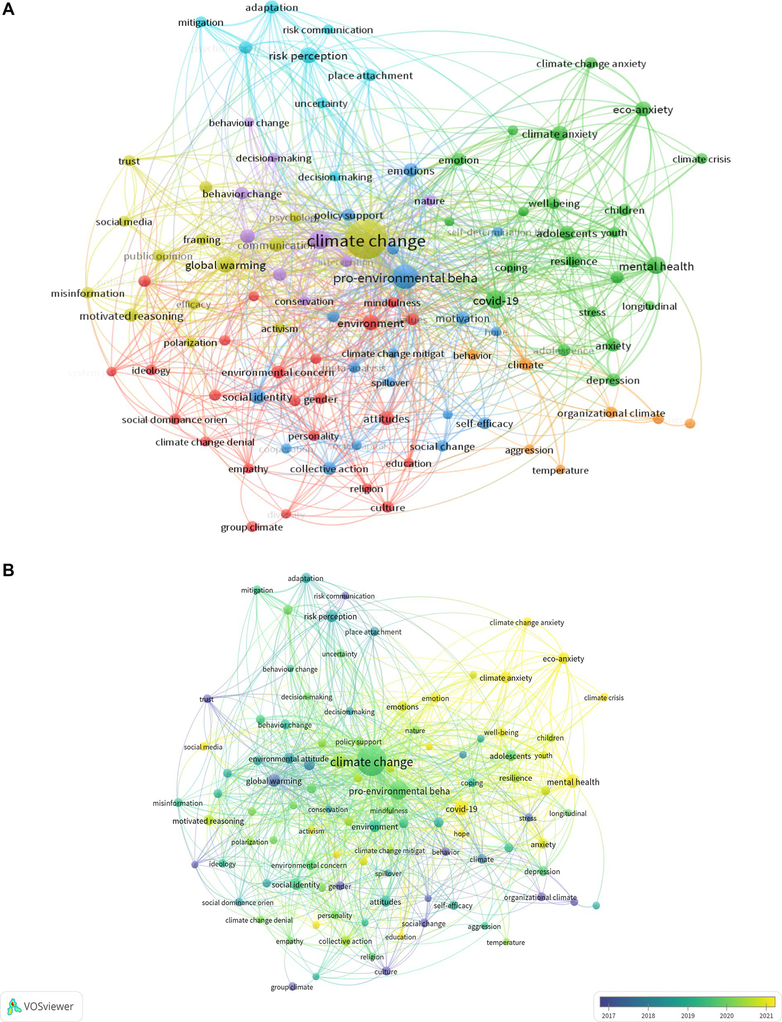 It’s clear from the visualizations (see Figure 3A) that the psychology of climate change, for instance, has seen a significant increase in scholarly output over time, as evidenced by the increasing trend lines in the cumulative occurrences graph. Notably, the journals “Frontiers in Psychology” and “Journal of Environmental Psychology” have shown notable growth in the number of documents produced, indicating a heightened scholarly focus on the psychological dimensions of human interaction with climate change.