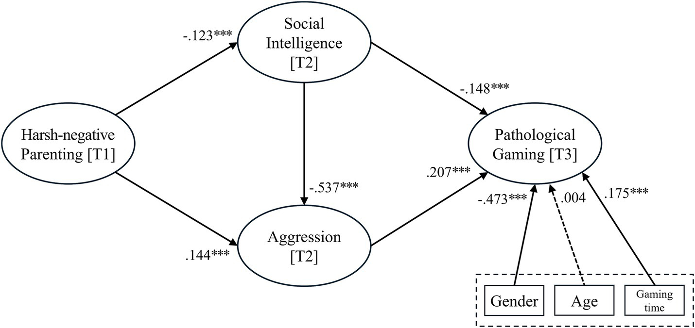 The results indicate that harsh-negative parenting strongly influences social intelligence and aggression, potentially leading to pathological gaming. Specifically, harsh-negative parenting decreased the degree of social intelligence but also increased aggression. Social intelligence, in turn, was associated with a decrease in pathological gaming, while aggression was linked to an increase in pathological gaming.