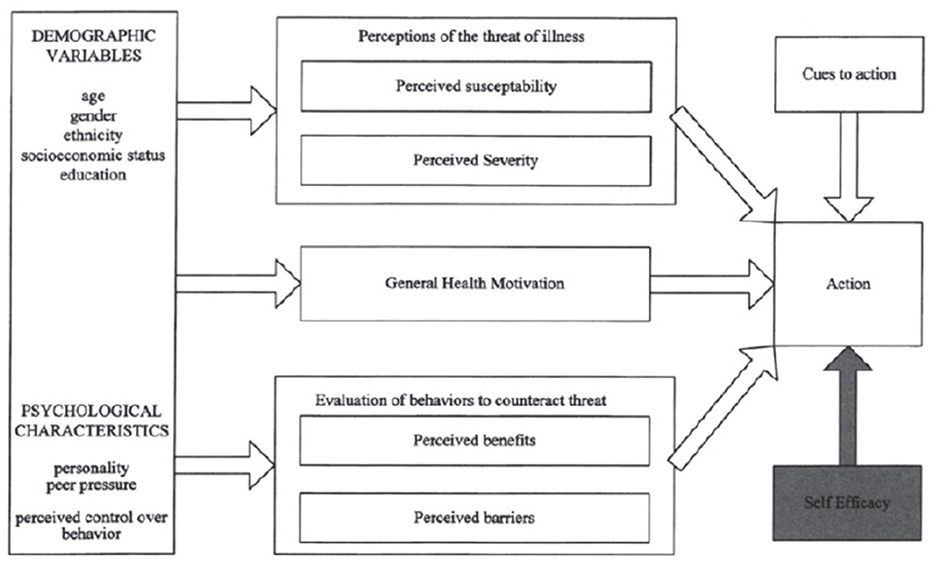 The HBM has been instrumental in understanding health behaviors since its inception in the 1950s, originally developed to explain the low uptake of tuberculosis screenings (Rosenstock, 1974). HBM incorporates key constructs such as perceived susceptibility, severity, benefits, barriers, and cues to action, later expanded in 1988 to include “self-efficacy” to better predict sustained behavior change (Rosenstock et al., 1988) (see Figure 1).
