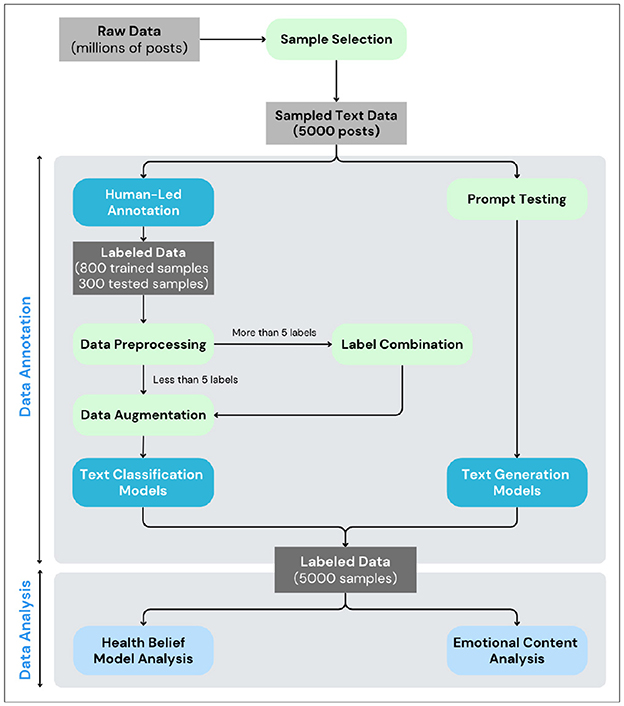 The analytical process flow is shown in Figure 2. From the original dataset, 5,000 posts were randomly selected for analysis. Two annotators labeled the posts based on Health Belief Model dimensions, including perceived susceptibility, severity, benefits, barriers, cues to action, and self-efficacy. This labeled data was then combined with 800 labeled rows identifying root causes of mental health issues from a previous study by Rani et al. (2024) to train the model. Based on the outcomes, 288–300 posts were chosen for further evaluation, aiming for an accuracy rate above 75% before examining the HBM and emotional content.