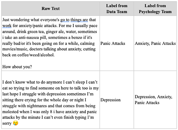 Figure 4 shows discrepancies in the labeling of raw text by the data and psychology teams. These differences highlight the complexity of the task and indicate why training models—especially for accurately classifying perceived severity—can be challenging.