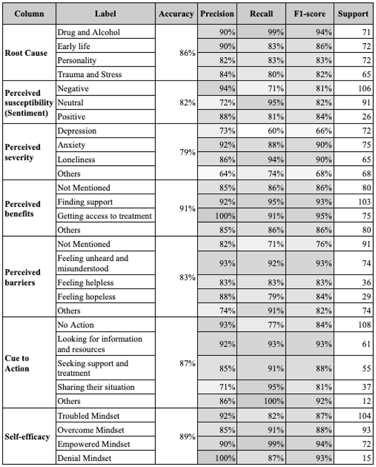 Figure 5 showcases the final performance metrics of models, revealing an overall precision exceeding 79% and F1 scores around 80%–90%. While most categories performed well, perceived severity had a notably lower accuracy of 47%, attributed to its inherent complexity and multi-label nature.