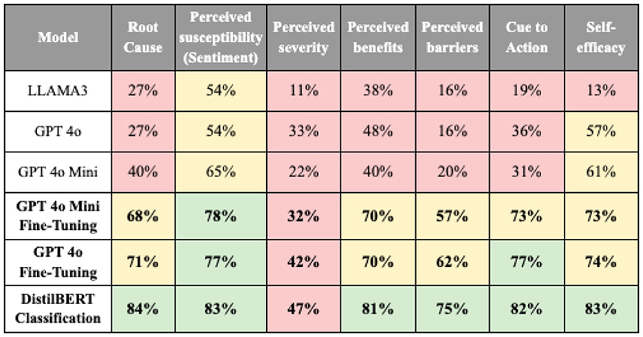 The results indicate that perceived susceptibility (81.5%) and self-efficacy (89.25%) had the highest alignment, while perceived severity (63.25%) exhibited the lowest agreement, due to the presence of multiple labels per text. This suggests that annotators more consistently agree on susceptibility and self-efficacy, whereas severity is more subjective and may require additional clarification or multiple indicators in the analysis.