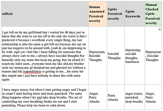 To address this, predicting labels, extracting keywords related to mental health, and combining them for the final prediction is suggested. While the initial output from GPT model produced a single result for perceived severity, the subsequent extraction of keywords enabled a more precise identification of multiple severity-related dimensions. Figure 7 presents examples of the predicted perceived severity after manual review, including the perceived severity labels and keywords generated by GPT-4o. As illustrated, irrelevant terms (e.g., deep breaths) were excluded, whereas salient issues—such as anger and panic attacks-were retained. Although this approach requires additional manual verification, it achieves an accuracy rate of 81% and enhances data relevance for analysis.