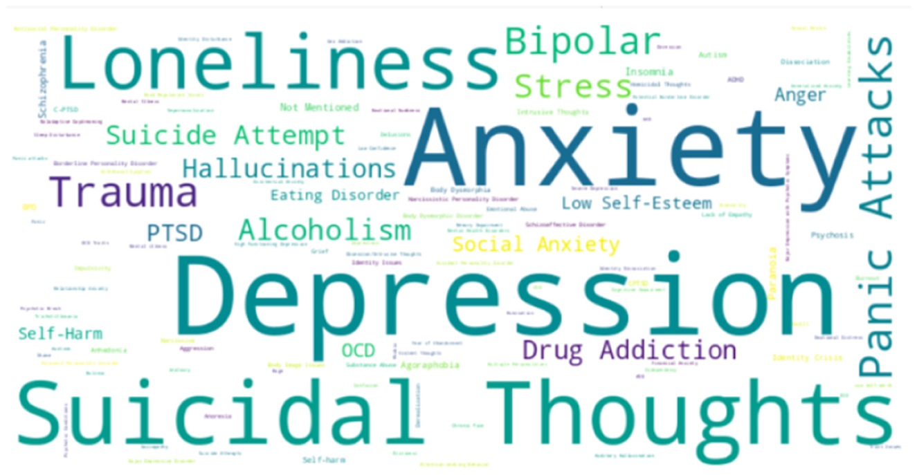For anxiety, prominent negative words included “anxiety” “anxious” “stop” and “worried” In depression, the most common terms were “depression” “hate” “lose” and “fuck” Suicidal thoughts featured words like “die” “kill” “suicidal” and “suicide.” In the Loneliness group, key words were “alone,” “lonely,” “hard” and “hate,” while in alcoholism or drug addiction, “stop” and “pain” were prevalent. The trauma or stress group highlighted words such as “stress” “trauma” and “stop” The “others” category featured “anxiety” “hard” “stop” and “hate.” Thus, while “no” and “bad” were common across all groups, each had unique words reflecting their emotional struggles.