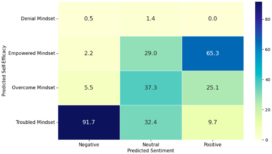 Most perceptions about mental health were neutral (48.3%), with negative perceptions at 45.1% and only 6.6% expressing a positive outlook. A majority (57.6%) felt troubled in managing their mental health, while 22.2% felt they had overcome obstacles. A notable correlation existed between perceived susceptibility and self-efficacy; positive sentiments correlated with higher self-efficacy, whereas negative sentiments linked closely to a troubled mindset (see Figure 9).