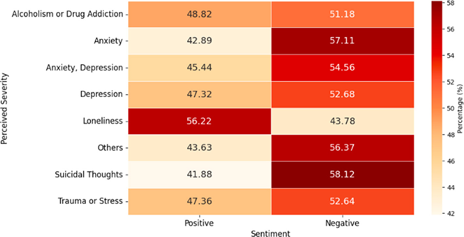 Regarding root cause, 50.1% of Reddit users attributed mental health problems to personality, with traits like chronic negativity or perfectionism increasing vulnerability. Trauma and stress accounted for 27.4%, followed by early life experiences (13.5%) and substance use (9.0%). In terms of perceived severity, depression and anxiety were the most discussed issues, with 1,471 and 1,415 posts, respectively, out of 5,000 analyzed.