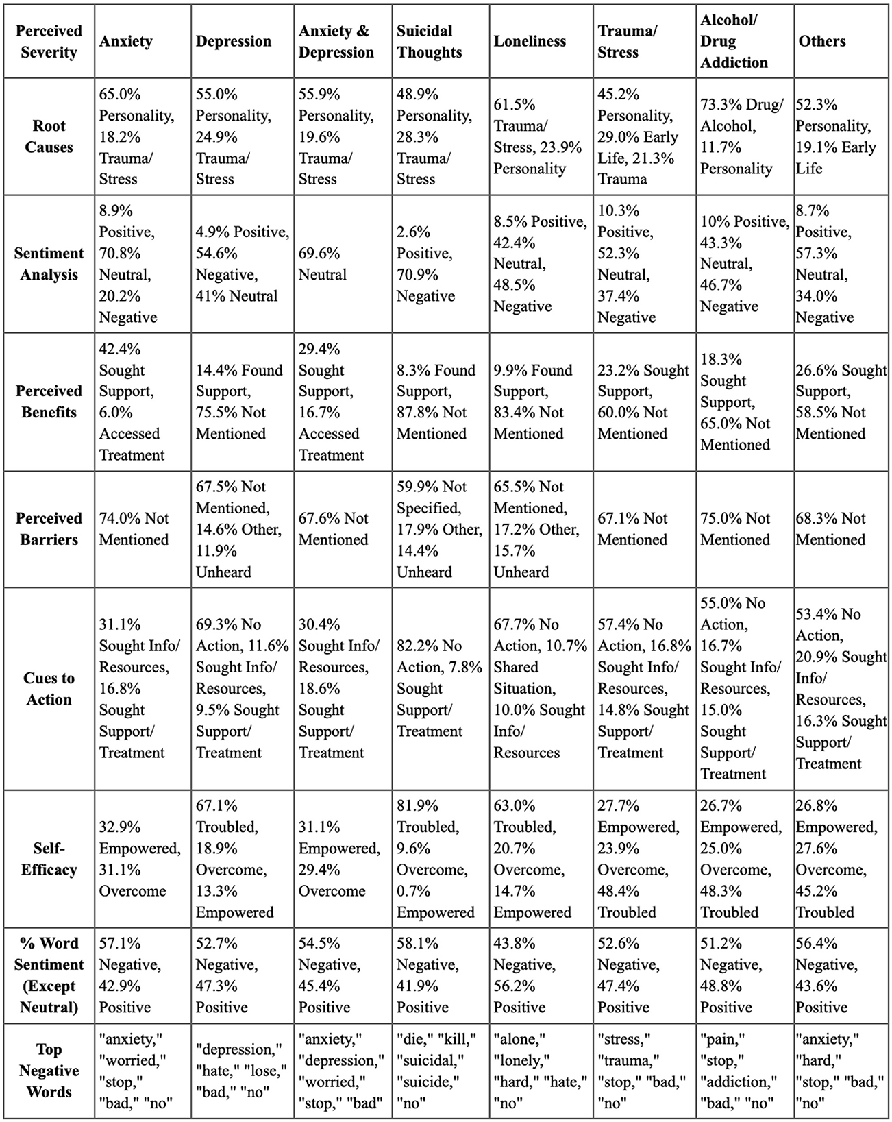 This integrated analysis offers a thorough understanding of health-related behaviors, perceptions, and emotional content within the context of mental health issues. Distinct patterns emerged in mental health issues: anxiety was influenced by personality traits and exhibited moderate negative sentiment. Depression showed high negative sentiment with significant inaction. Suicidal thoughts displayed the highest negative sentiment and extreme inaction, indicating a need for targeted interventions. Loneliness, associated with trauma, reflected balanced sentiment but substantial inaction.