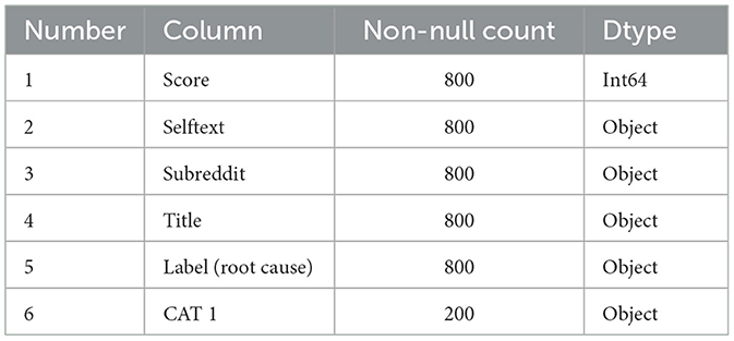 The dataset consists of millions of rows and seven columns, incorporating both qualitative features (Title, Author, Selftext, Subreddit) and quantitative features (Score, Created_utc, Timestamp). Among these, the labeled dataset contains 800 entries with two relevant columns: Label, representing the root cause, and CAT1, providing a deeper, more detailed level of the root cause, as illustrated in Table 1 (Rani et al., 2024). While CAT1 offers additional granularity, this research focuses primarily on the Health Belief Model, so that column was not used in the analysis. This research specifically analyzes a subset of posts from May to July 2022, following the onset of the pandemic.