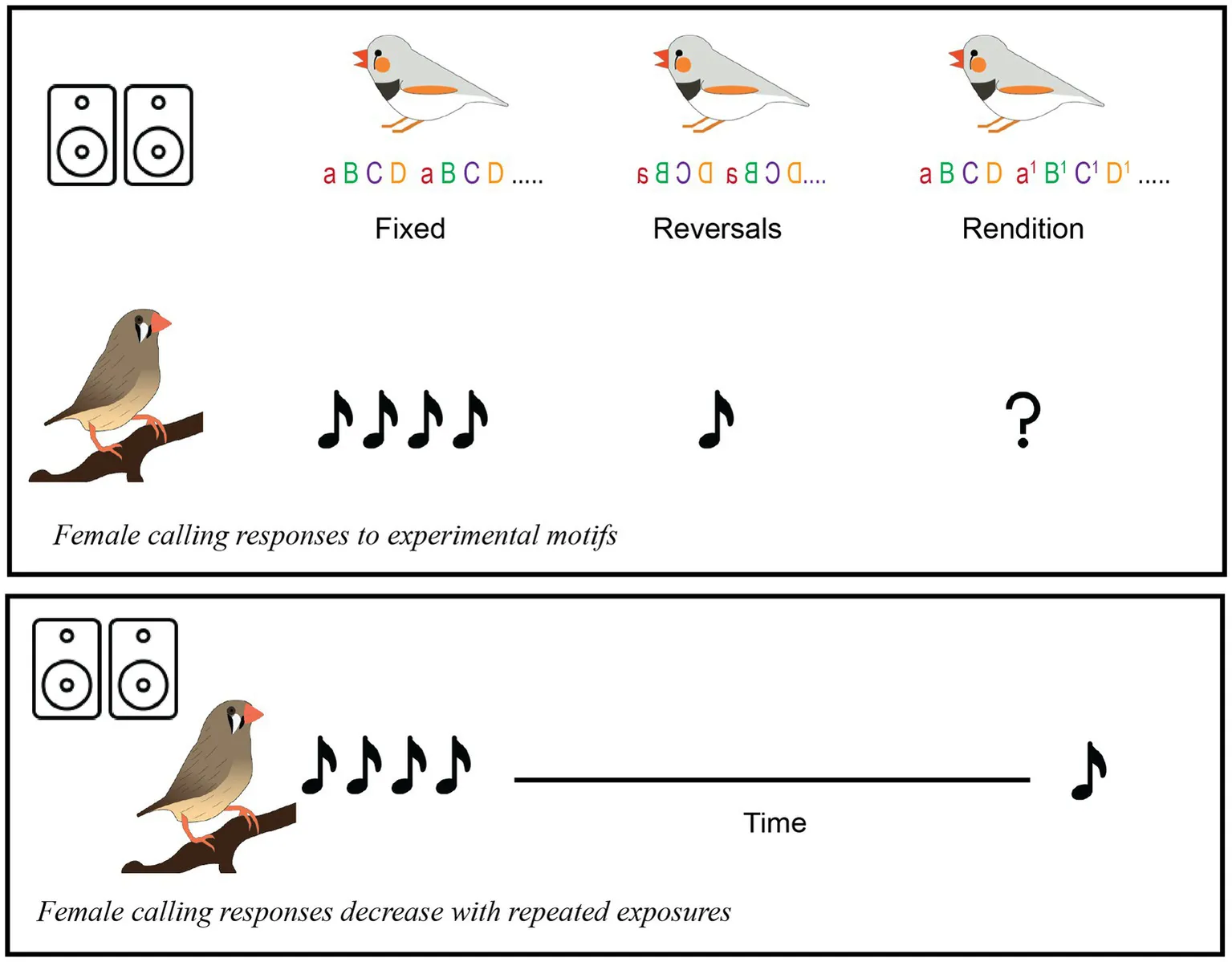 Schematic of experimental playback conditions. Song syllables are indicated with letters (a, b, c, d) and two motifs for each song bout are depicted.
