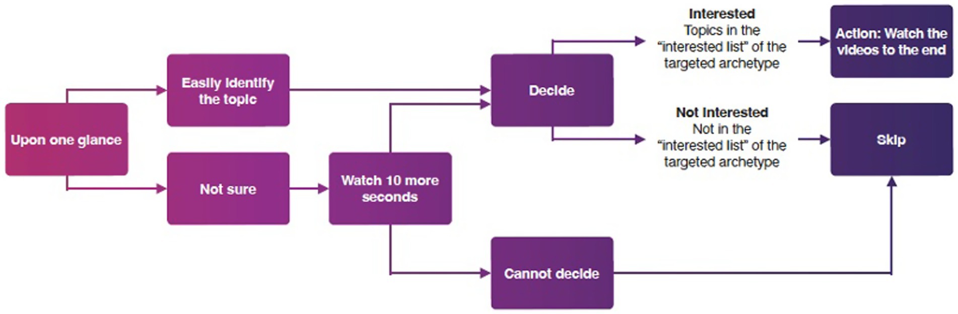After identifying the interests of the four archetypes and outlining the procedure for video viewing (see Figure 1), each archetype was sequentially run for 7 days, spanning from August 22nd to September 27th, 2023, on four factory-reset iPads. No identifying information was provided to TikTok during the account creation process. Due to ethical considerations, especially concerning interactions with users under the age of 18, the only activity conducted on the archetype accounts was video watching. No proactive actions such as liking, commenting, or searching were performed. For each archetype, a researcher spent 1 h per day watching videos on TikTok continuously for 7 days. Seven days were set as the window for watching and collecting videos, given the limitations of analyzing vast quantities of video data, and the observation that after 5 days of watching, the algorithm had reached saturation in the typologies of videos presented.