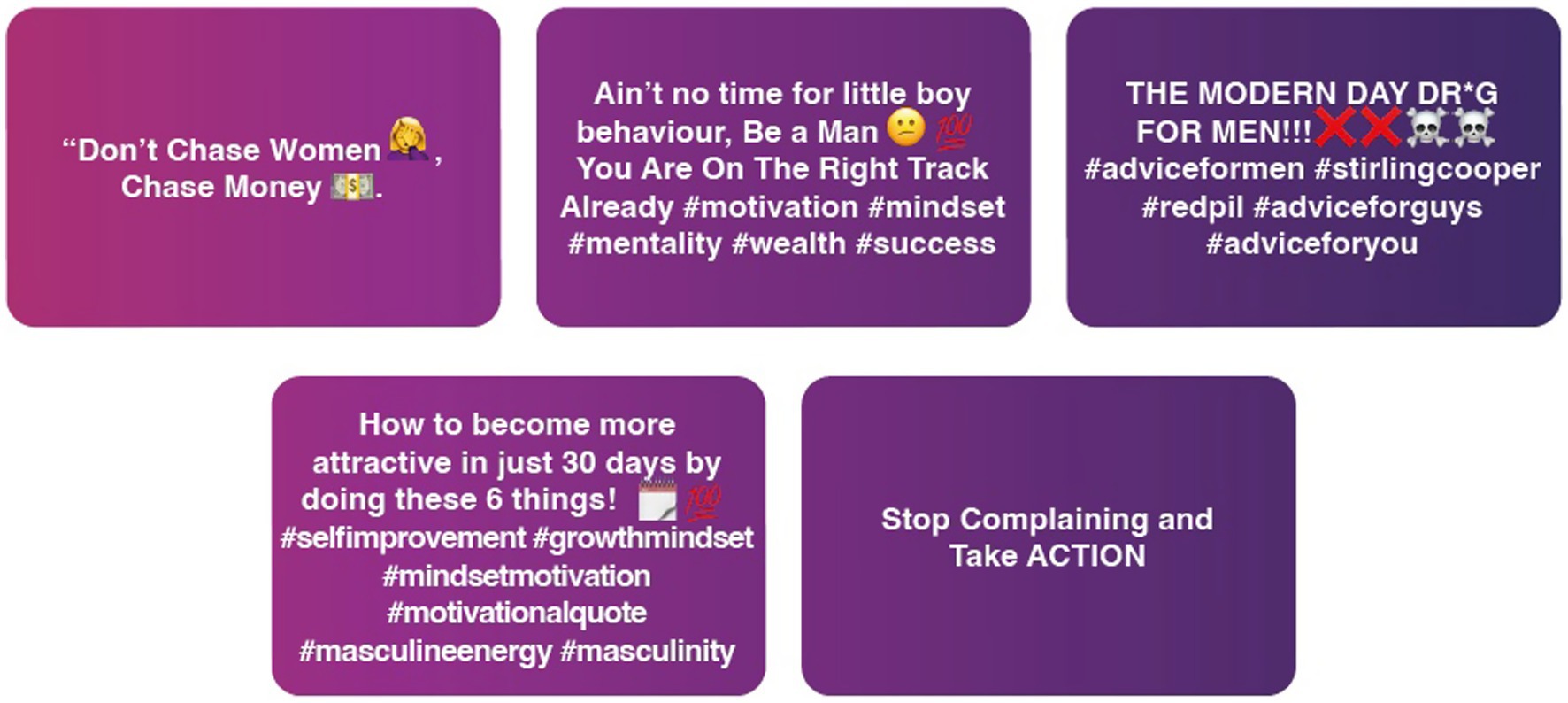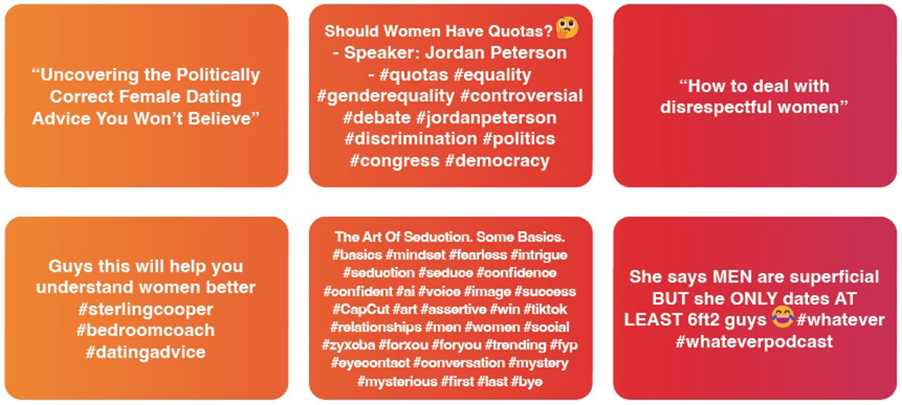 Throughout the analyzed content, the four accounts primarily featured posts centered around dating and relationships that reflected these views. These posts included advice on how to attract women, strategies for seduction, and critiques of female behavior using stereotypical and pseudo-psychological analysis. There was a strong emphasis on masculinity, strength, and self-improvement, alongside the presentation of traditional gender roles and hierarchies within relationships as desirable. While some content addressed male behavior, a significant portion transitioned into specific videos that propagated negative and misogynistic tropes about ‘how women think.’ Critical posts such as ‘the truth about female nature...’ and ‘understanding the female narcissist’ portrayed relationships as transactional and perpetuated damaging stereotypes regarding expectations of sex.
