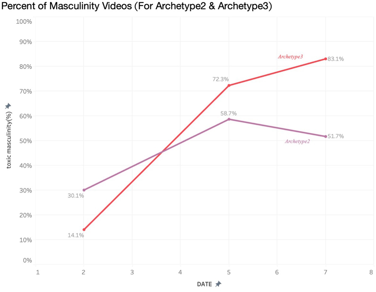 The increasingly radicalism threading of this content was subtle, as users ‘microdose’ on progressively more negative, toxic material. Initially, the content presented to the archetypes often acknowledged and empathized with themes regarding social difference within men, delving into discussions regarding loneliness or personal growth. However, with prolonged usage, this content increasingly shifted toward expressions of anger and assigning blame. Of the four archetypes, there was a distinct divergence in the type of content presented after day 5. Archetypes 1 and 4 saw a significant continued rise of misogynistic content over the 7 days.