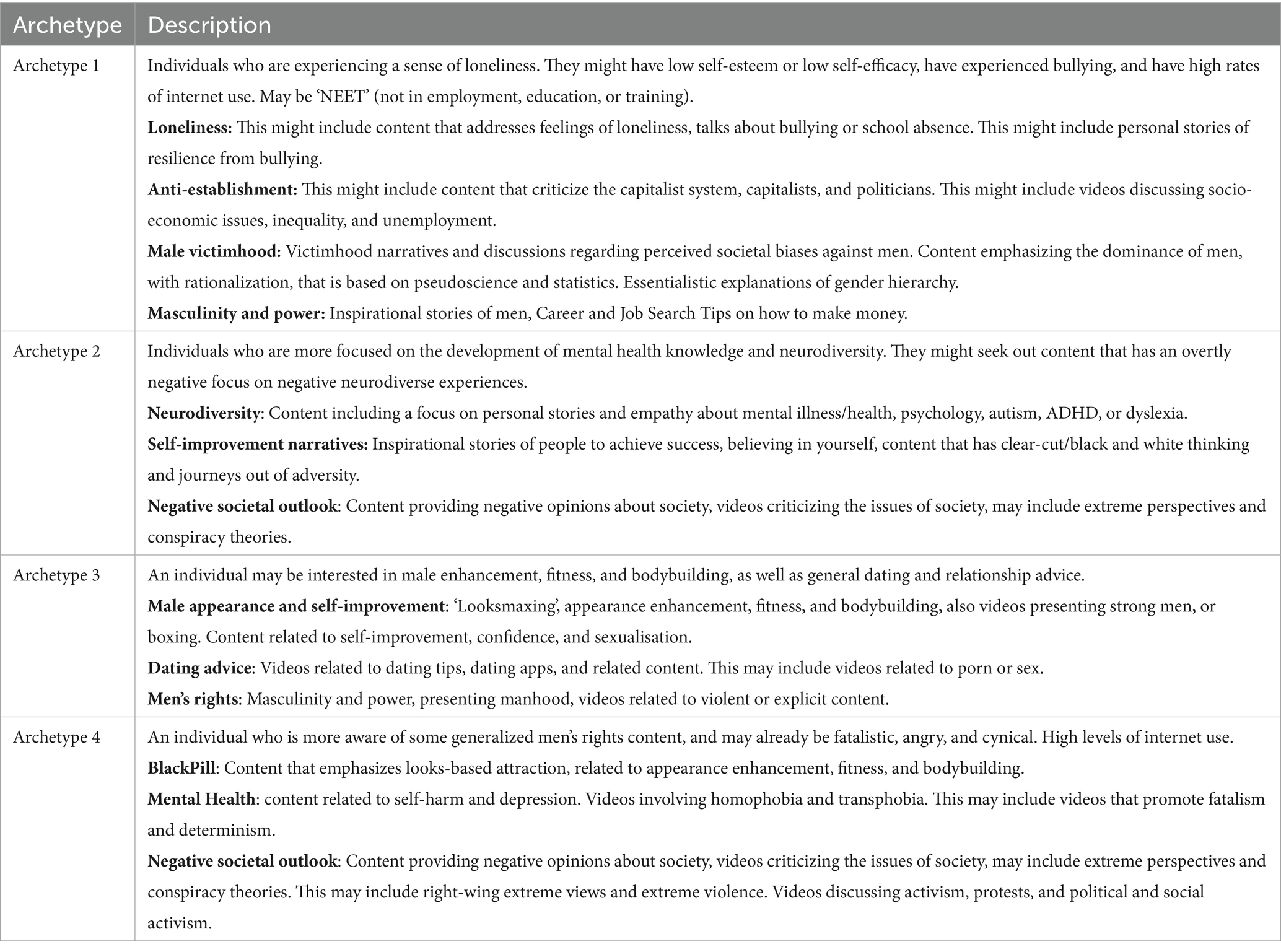 In our study, four archetypes were developed to examine how initial interests in key thematic areas influence the presentation of misogynistic content to young people through the TikTok algorithm. These archetypes were constructed based on the thematic analyses of the interviews with individuals engaging in misogyny, incorporating specific terms and interests derived from typical users. After two authors (CS, IC) undertook a thematic analysis of the interviews, a reflexive, collaborative thematic analysis workshop was conducted with all authors, where the thematic analysis was presented and subsequently discussed to identify vulnerabilities and decide on criteria for archetypes. This was then developed and confirmed with all members of the research team prior to implementation.