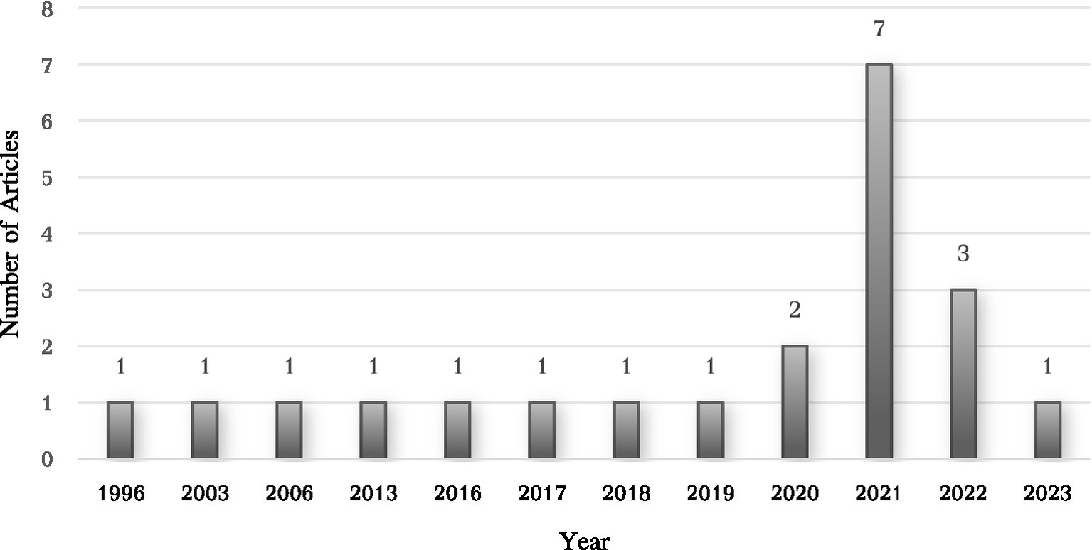 Figure 2 presents the distribution of data across different years from 1996 to 2023. The data shows that several years, such as 1996, 2003, 2006, 2013, 2016, 2017, 2018, and 2019, each have a frequency of 1, indicating relatively low data occurrences in those years. Notably, 2020 stands out with a frequency of 2. The years 2021- and 2022-mark significant peaks in the distribution, with 7 and 3 occurrences respectively, suggesting a concentration of data or research activity during this period. The frequency decreases slightly in 2022 and 2023, with 3 and 1 occurrences, respectively.