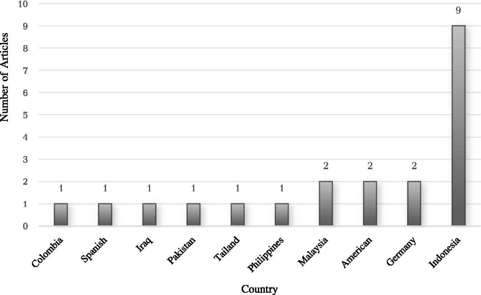 Figure 3 illustrates the distribution of data across different countries. The chart reveals that the data is most heavily concentrated in Indonesia, which accounts for 9 occurrences, significantly higher than any other country. Malaysia follows with 2 occurrences, and both the United States and Germany have 2 occurrences each. Other countries, including Colombia, Spain, Iraq, Pakistan, Thailand, and the Philippines, each have a frequency of 1, indicating a more limited representation in the dataset.