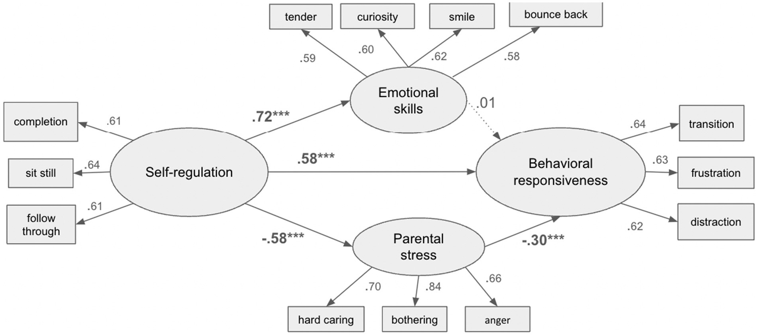 Several empirical studies have supported emotional skills as mediating variables between self-regulation and children’s behavioral or social outcomes (Eisenberg et al., 2003; Shields et al., 2001; Trentacosta and Izard, 2007). These findings suggest that emotional understanding and regulation may help children apply their self-regulatory capacities in socially appropriate ways, thereby promoting adaptive behavioral responsiveness. Additionally, while cross-sectional (Claussen et al., 2021), longitudinal (Edossa et al., 2018), and intervention studies (Housman et al., 2018) have demonstrated a positive relationship between children’s self-regulation and emotional skills, limited research has focused on the specific pathways linking children’s emotional skills with self-regulation and behavioral responsiveness. In selecting emotional skills as a mediator, we aimed to capture the socio-emotional interpretive processes that may link self-regulation to behavioral outcomes. This addition acknowledges that emotional skills, while situated at the same individual level as self-regulation, offer a distinct pathway by which children make sense of and respond to social experiences. Therefore, the following hypothesis is proposed: