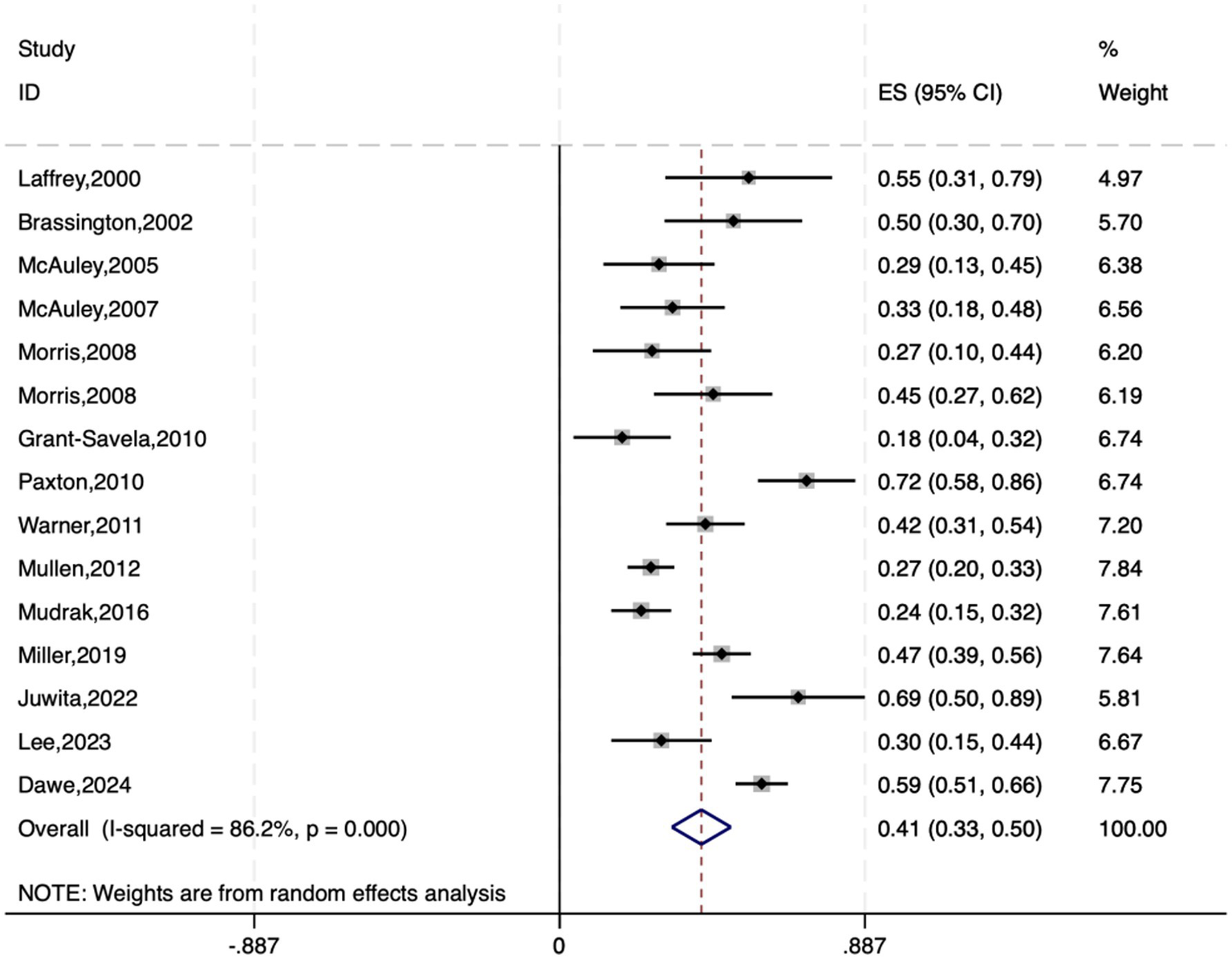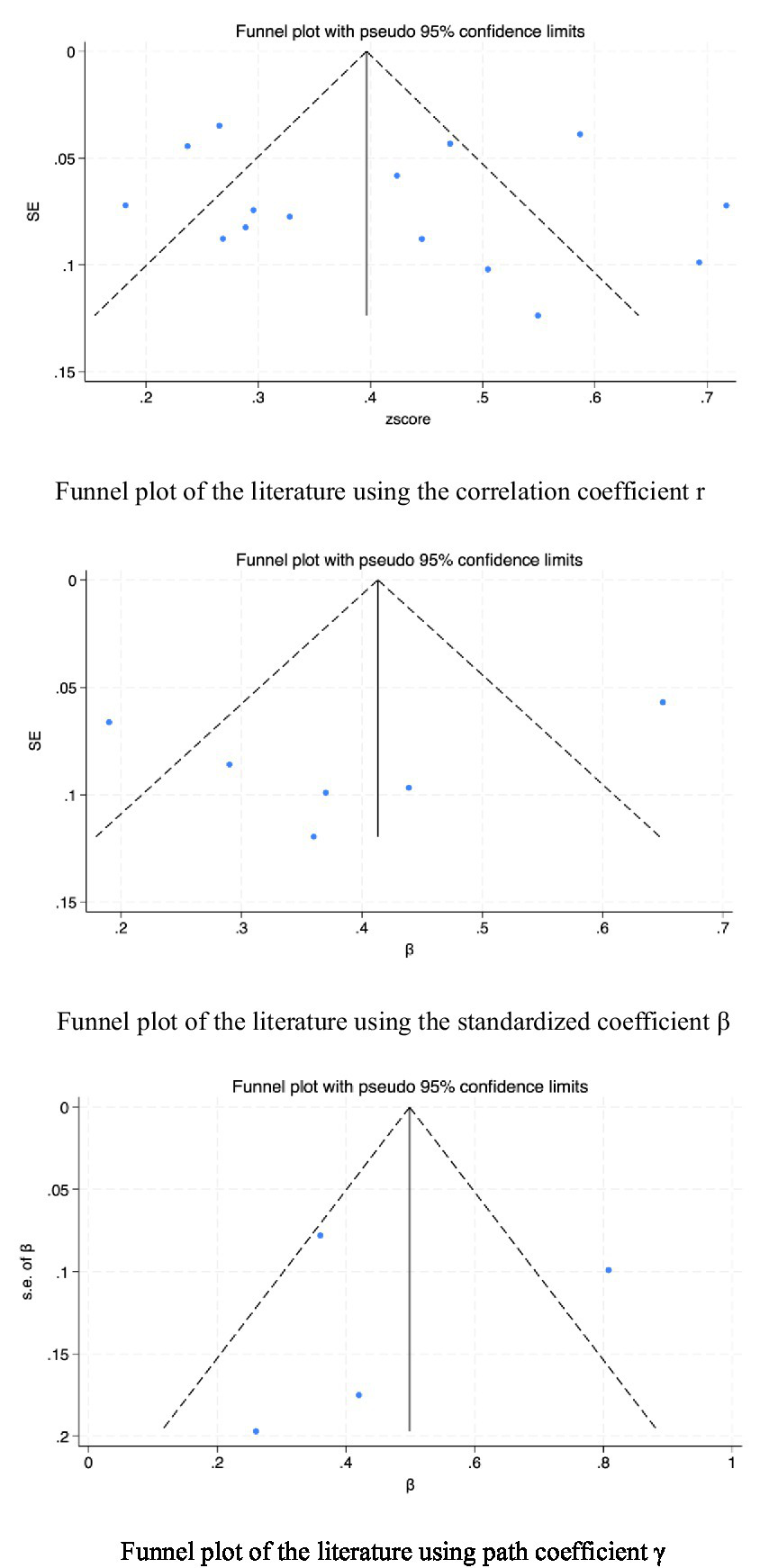 Each study included in this review provided data on the association between exercise self-efficacy and physical activity in elderly individuals, along with the sample size. For longitudinal studies, we selected baseline association data for analysis; for studies that used different assessment tools, we conducted a meta-analysis to combine the association data. The meta-analysis was performed using Stata 18 software, and the converted effect sizes were analyzed. We used a fixed effects model (I2 < 50% and p > 0.05) or a random effects model (I2 ≥ 50% or p < 0.05) based on the results of the heterogeneity test. The level of heterogeneity was assessed using the I2 index and categorized as low (I2 ≤ 25%), moderate (25% < I2 ≤ 50%), or high (I2 > 50%) (Liu et al., 2023; Higgins et al., 2003). To detect publication bias, we performed Egger’s test and presented the analysis results in funnel plots.