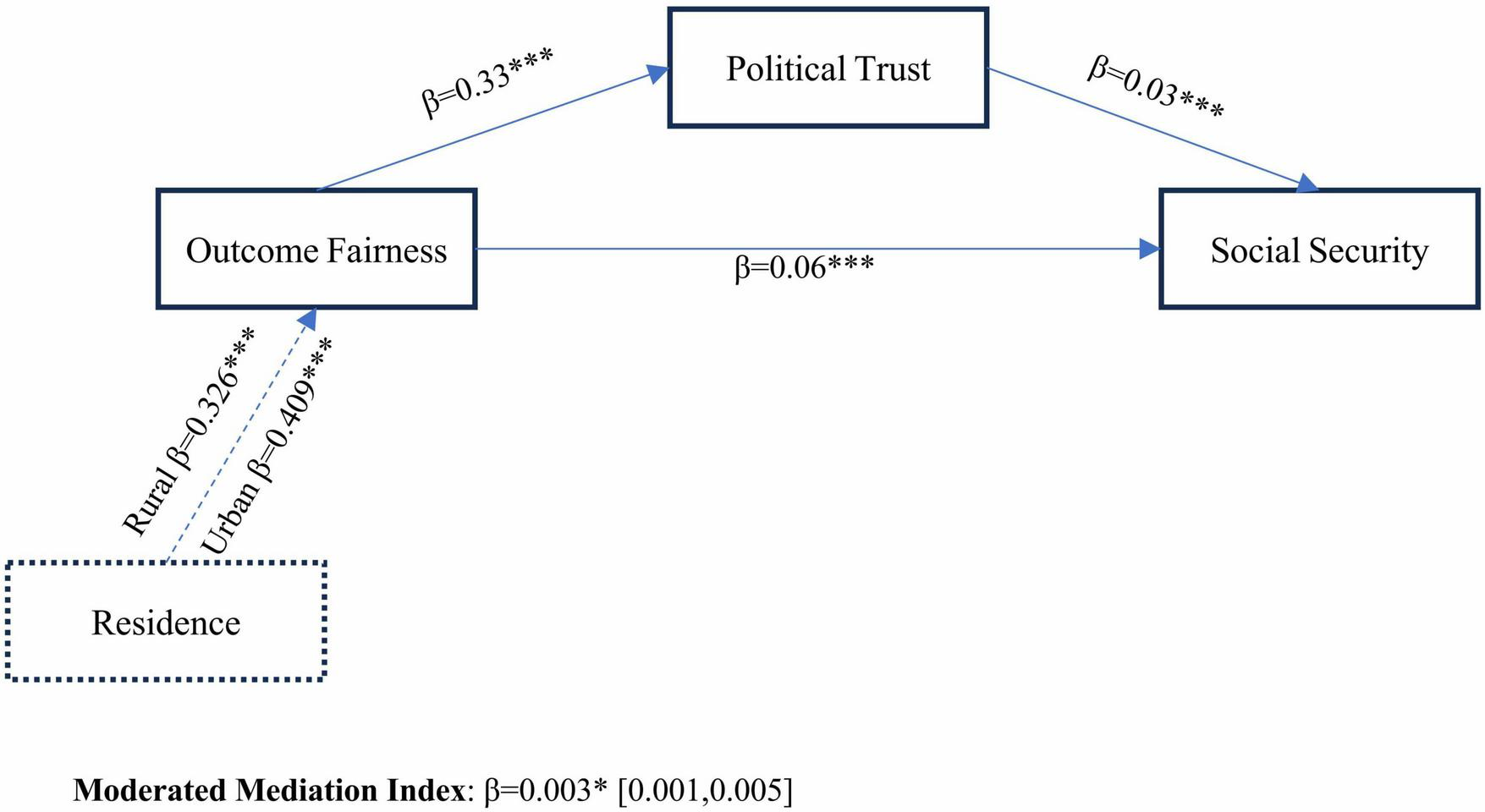 The mediating role of political trust may be further shaped by systemic disparities between urban and rural China. Rural populations, often excluded from equitable access to healthcare and economic relief (He et al., 2022), are more reliant on government welfare, potentially amplifying the importance of outcome fairness in fostering trust. In contrast, urban residents, with greater exposure to market-driven opportunities, may prioritize procedural fairness (e.g., transparent policy implementation) as a basis for political trust (Xu et al., 2020). Enria et al. (2021) illuminate the critical moderating role of policy transparency in repairing trust-fairness dynamics during systemic crises. This mechanism resonates with the rural-urban divergence observed in our study, suggesting that differential transparency in local governance (e.g., clarity of pandemic relief criteria) may explain why fairness perceptions translate into trust more effectively in urban contexts. These contextual differences suggest that the strength of political trust’s mediation between fairness perceptions and security may vary across rural and urban settings, though the core mediation hypotheses (H2a, H2b) are expected to hold universally.