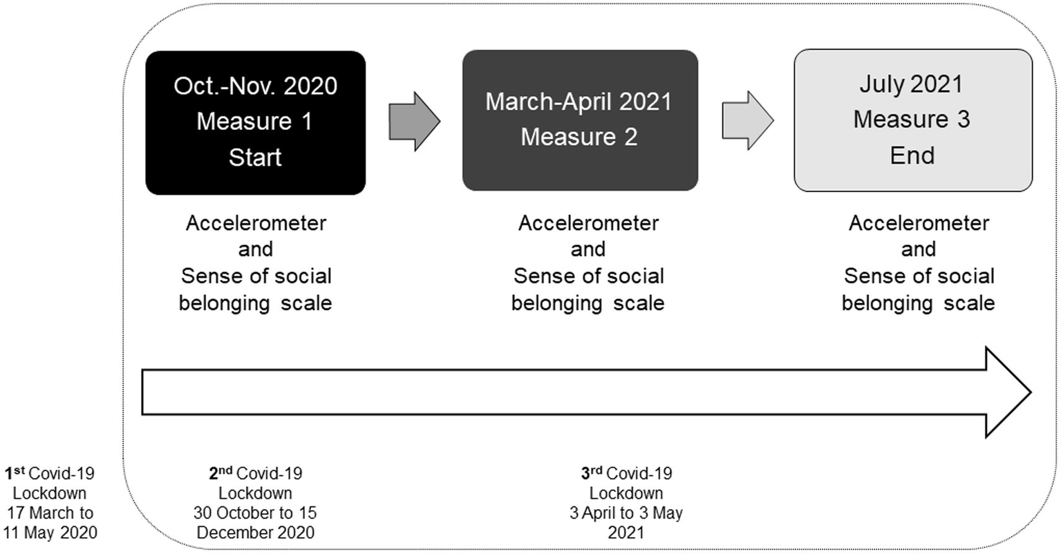 From October 2020 to July 2021, 57 subjects underwent a multidimensional assessment. There were three assessment times over 10 months for the sense of social belonging, physical activity, and sedentary behavior (Figure 1). The first measurement time, which included questionnaires and accelerometers, was from 2 October 2020 to 6 November 2020. These questionnaires were comprehensive, including a demographic part to ensure a thorough understanding of the participants. The participants began wearing the accelerometers 1 day after completing the questionnaires. The second measurement time, which focused on the sense of social belonging questionnaire and the accelerometers, was from 20 March 2021 to 25 April 2021. The third evaluation, which was identical to the second one, was from 29 June 2021 to 30 July 2021. The mean delay between the administration of the tests and measurements with the accelerometers was 39 days (SD = 17.20). This delay was due to the time that had to be waited for the quarantine of some participants who contracted the Covid-19 virus.