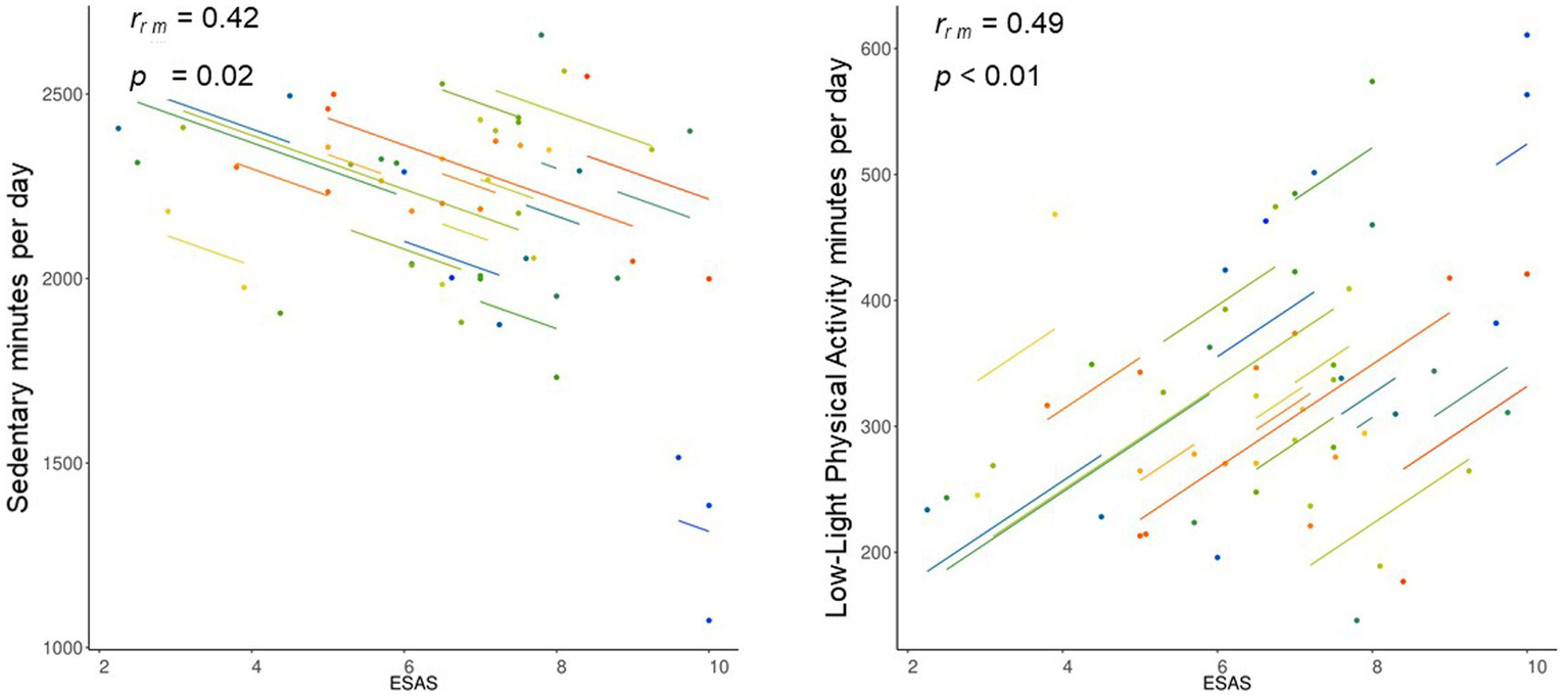 Table 2 shows repeated measures correlations results over the study. Sedentary time was significantly and negatively related to Light PA intensities (i.e., Low-Light PA and High-Light PA) and the ESAS (Figure 2).