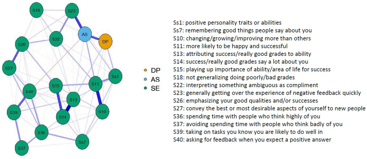 After reviewing the hypotheses, an additional non-preregistered post-hoc network analysis was conducted to further examine the previously unknown relationships between decentering and the strategies in more detail. The aim of the network analysis was to investigate possible central strategies that, for example, are particularly strongly related to the decentering factors Distanced Perspective or Accepting Self-perception. Network analyses are now a widely used method for examining psychological constructs, where all variables are treated as observed variables (instead of latent variables as in classic test theory; Borsboom, 2017). The network is based on a partial correlation matrix, to which a tuning parameter (Least Absolute Shrinkage and Selection Operator, LASSO) is applied to reduce spurious correlations. The result is a sparse (partial) correlation matrix. LASSO produces multiple networks with varying degrees of conservative tuning parameters. To determine the best tuning parameter (the sparseness of the correlation matrix), the Extended Bayesian Information Criterion (EBIC) can be used (preferring the model with the lowest EBIC). The sparse partial correlation matrix is then graphically represented (glasso), where nodes represent the questionnaire items and edges represent the partial correlations between items. Positive correlations are represented by blue edges and negative correlations by red edges. The thicker the edge weight, the larger the correlation (Hevey, 2018). In this post-hoc analysis, three networks were estimated using the sum scores of the decentering factors Accepting Self-perception and Distanced Perspective and the individual items for self-protection, self-enhancement, and self-affirmation. For each network, the centrality measures strength and betweenness were determined. Strength is derived from the sum of all edge weights and represents the total number of connections a node has within the network. Betweenness indicates how often a node lies on the path between two other nodes, essentially showing if it acts as a mediator or intermediary between two other nodes (Hevey, 2018). The network analyses were conducted using the qgraph package (Epskamp et al., 2012).