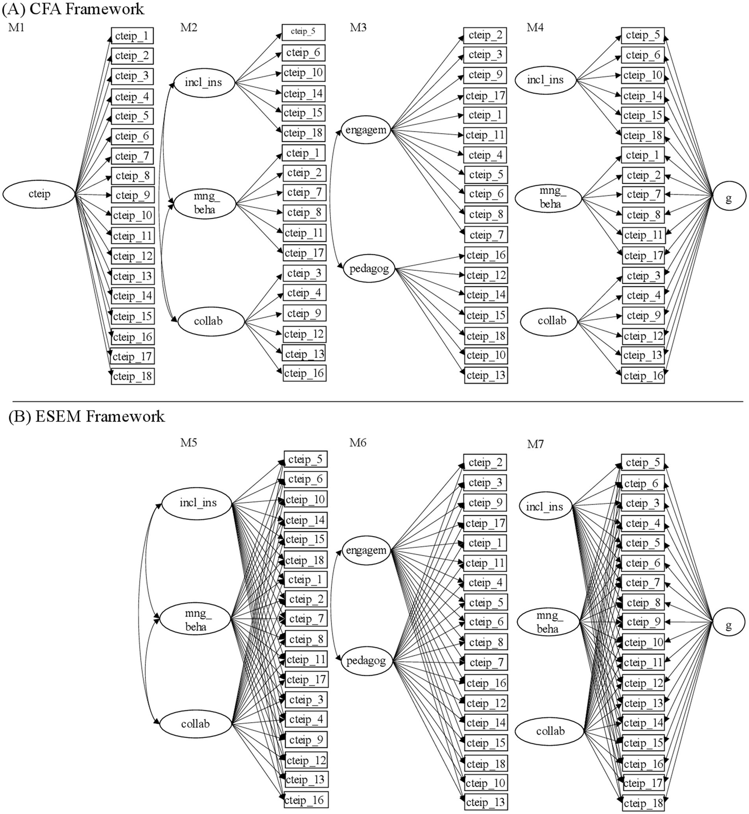 Graphical representations of the tested models’ theoretical structure (M1 to M7). cteip: Collective teachers’ efficacy for inclusive practices. incl_ins: Efficacy to use inclusive instructions. mng_beha: Efficacy in managing behavior. collab: Efficacy in collaboration. engagem: Efficacy in proactive engagement. pedagog: Efficacy in pedagogical engagement. g: General factor. (A) Describes the CFA framework, (B) Describes the ESEM framework.
