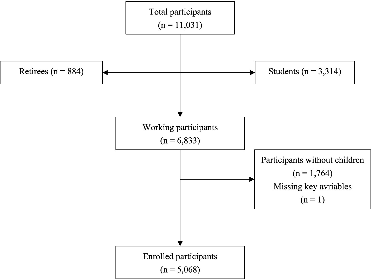 Based on the sample inclusion and exclusion criteria, research data from 5,068 working parents were ultimately included in this study (Figure 1).