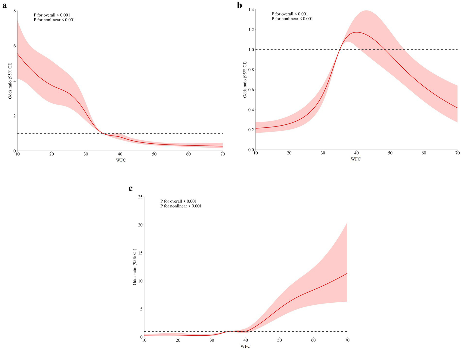 As depicted in Figure 2, participants could remain anxiety-free when their WFC scores were below 35, suggesting that individuals were generally able to manage lower levels of conflicts effectively. However, as WFC scores increased beyond this threshold, the risk of experiencing anxiety rose significantly. Specifically, within the range of 35 to 40 points on the WFC, a notable increase in the odds of mild anxiety was observed. When WFC scores exceeded 40, the odds of moderate to severe anxiety increased substantially. The RCS analysis revealed a clear pattern: as WFC increased, the risk of anxiety correspondingly rose, with a particularly sharp escalation at higher levels of conflict.