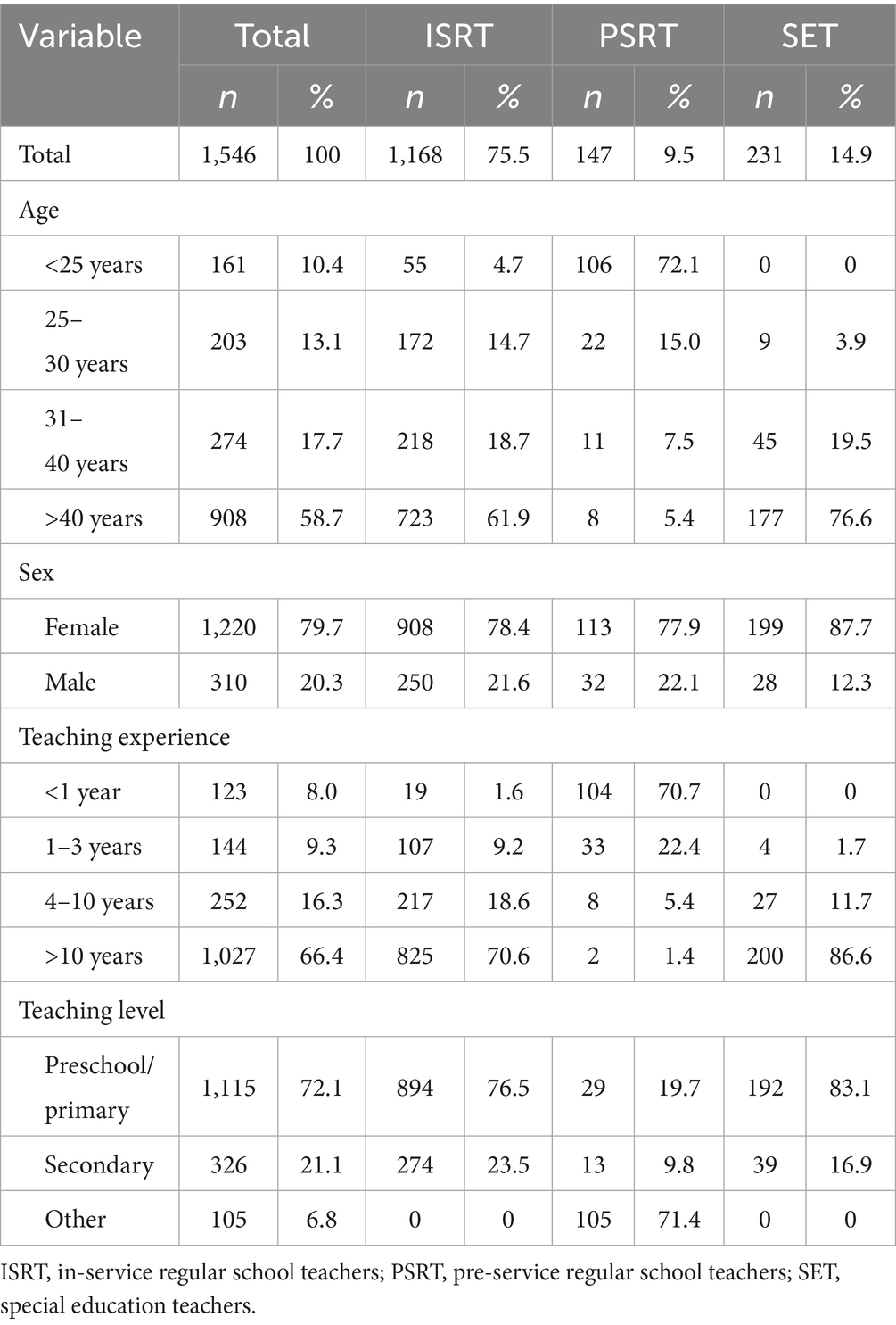 Participants were invited to fill in an online survey and were recruited in three ways. First, teachers were contacted by a collaboration with a regional professional association of teachers, which sent the link to the survey to their members. Second, the link to the survey to school principals of 200 randomly selected schools in the German-speaking part of Switzerland, with the request to forward it to their teachers. Third, the link to the survey was sent to pre-service teacher students at the Bern University of Teacher Education. A total of 2009 participants filled in the survey. Of these, the following individuals were excluded: (a) individuals currently not working as regular or special teachers and not registered as pre-service teachers at pre-primary, primary or lower secondary school levels, (b) special education teacher students and (c) special education teachers working in special schools or classes. The rationale for these exclusion criteria were to reduce heterogeneity within groups as best as possible. A total of 1,546 pre- and in-service regular teachers and special education teachers matched these criteria. Due to anonymous data collection, an accurate response rate cannot be reported. However, regarding teaching level, sex, and age, the sample characteristics are comparable to the general teacher population in Switzerland (Swiss Federal Statistical Office, 2018). Descriptive statistics for the three teacher samples (PSRT, ISRT, and SET) is displayed in Table 1.