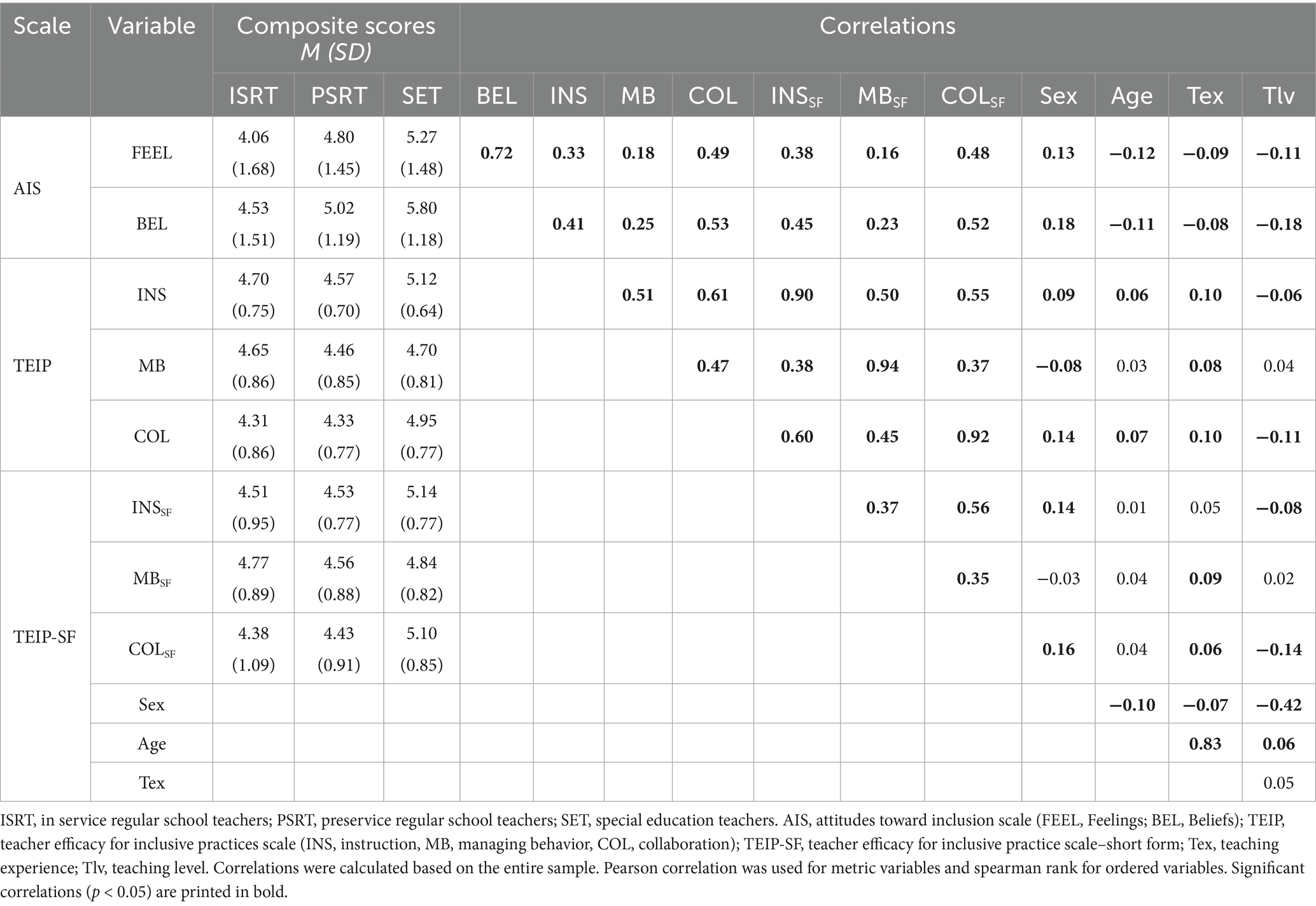 Discussion: The findings support the use of the AIS and TEIP-SF for assessing attitudes and self-efficacy toward inclusion across different teacher groups and support domain-specificity of teacher self-efficacy.