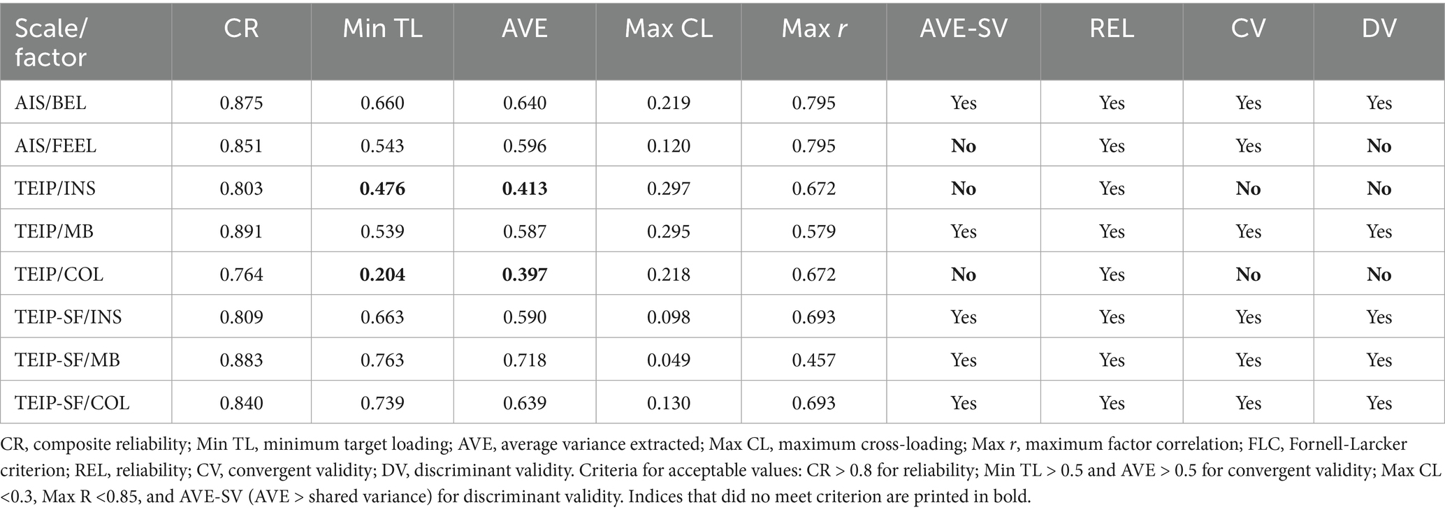 The TEIP-SF demonstrated the strongest psychometric properties, with all three factors showing good reliability (CR ranging from 0.809 to 0.883), convergent validity (all target loadings > 0.66 and AVE > 0.59), and discriminant validity (cross-loadings <0.13, factor correlations <0.70, and all factors meeting the AVE-SV criterion).