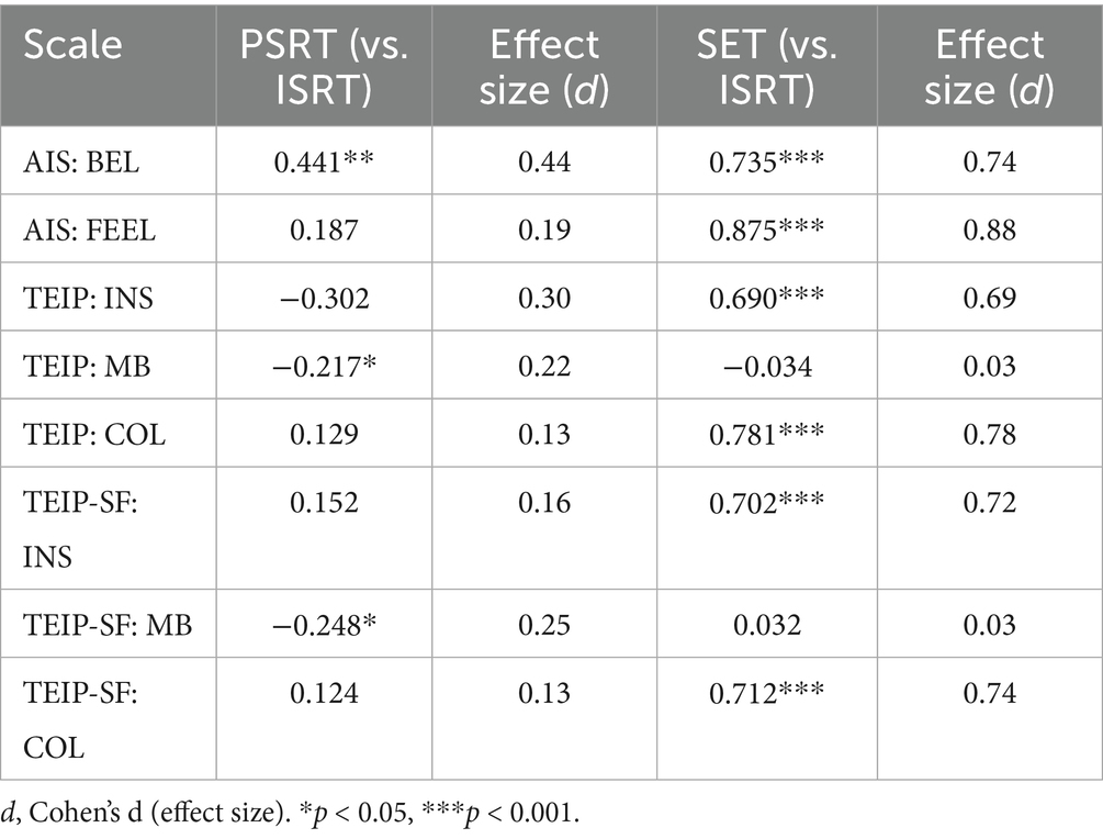 For the AIS scale, both PRST (M = 0.441, SE = 0.148, p = 0.003, d = 0.44) and SET (M = 0.735, SE = 0.079, p < 0.001, d = 0.74) showed significantly more positive beliefs about inclusion than IRST. For feelings about inclusion, SET (M = 0.875, SE = 0.206, p < 0.001, d = 0.88) showed significantly more positive feelings than ISRT, while PSRT (M = 0.187, SE = 0.097, p = 0.055, d = 0.19) did not differ from ISRT.
