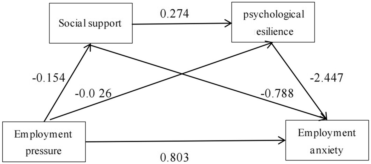 Taking the employment stress of sports major students as the independent variable, employment anxiety as the dependent variable, social support and psychological resilience as the mediating variables, this study used SPSS26.0 and PROCESS4.1 plug-ins to analyze the relationship between the factors under the condition of controlling demographic variables such as gender, age, place of origin, and major category, and examined the chain mediating role of social support in the relationship between employment stress and employment anxiety. The results are shown in Table 3. The analysis includes several steps. First, a regression model is established using employment anxiety as the dependent variable and employment stress as the independent variable. The results show that employment stress has a significant positive impact on employment anxiety (β = 0.803, p < 0.001), which supports Research hypothesis 1. As can be seen from the table above, the employment stress of the sports major students participating in this study positively predicted employment anxiety (β = 0.803, p < 0.001) and negatively predicted social support (β = −0.154, p < 0.001); When employment stress and social support predicted psychological resilience at the same time, employment stress negatively predicted psychological resilience (β = −0.026, p < 0.001), and social support positively predicted psychological resilience (β = 0.016, p < 0.001); When employment stress, social support, and psychological resilience were simultaneously entered into the equation, social support negatively predicted employment anxiety (β = −0.788, p < 0.001), psychological resilience negatively predicted employment anxiety (β = −2.427, p < 0.05), and employment stress positively predicted employment anxiety (β = 0.611, p < 0.001). The regression coefficients show that social support and psychological resilience play a partial mediating role and a chain mediating role in employment stress and employment anxiety, supporting Hypothesis 2 and Hypothesis 3.