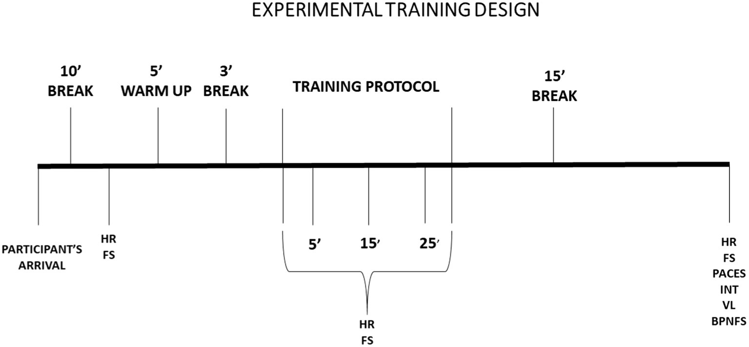 In all protocols, heart rate (HR) was continuously monitored throughout the training session. The Feeling Scale (FS) (Guthold et al., 2018) was administered five times: at rest, at the 5th, 15th, and 25th minutes of the session, and 15 min post-training. Following the completion of each protocol, participants remained seated for 15 min during the recovery period. During this time, the FS, the Physical Activity Enjoyment Scale (PACES) (Strain et al., 2024), and the Intention to Repeat the Exercise Session Scale (INT) (Mayo et al., 2019) were applied, in accordance with established guidelines for aerobic exercise analysis (Mielke et al., 2018).