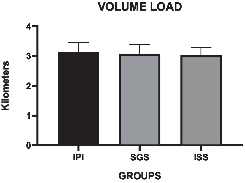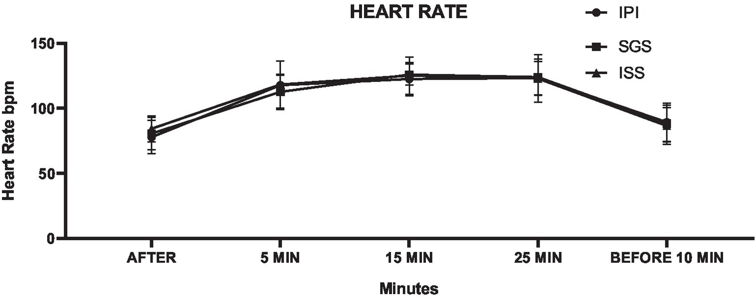 Heart rate data are presented in Table 3, with the mean HR during the exercise session remaining within the moderate intensity range for all groups: IPI = 70.5% HRmax, SGS = 70.3% HRmax, and ISS = 71% HRmax. The two-way ANOVA revealed a minimal interaction effect between group and time across the different groups (F = 1.17, p = 0.31, η2 = 0.02).