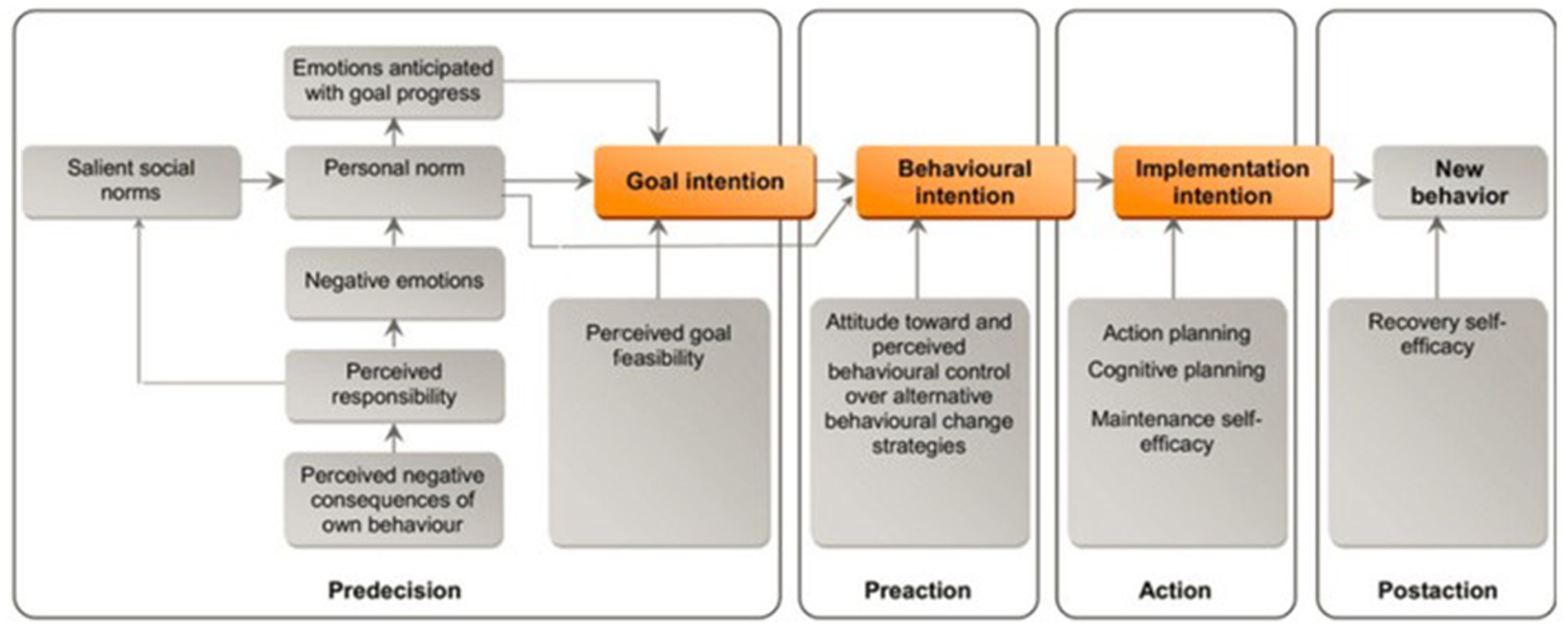 In the first stage, the predecision stage, the current behavior needs to be perceived as problematic, leading to an intention to reduce this behavior and, subsequently, the negative consequences resulting from it (goal intention). Variables assumed to influence the formation of such a goal intention are primarily taken from the norm activation model (NAM; Schwartz and Howard, 1981). In the next stage, the preaction stage, an individual has to choose an alternative behavior to achieve the goal of reducing their current problematic behavior formed in the predecision stage. The formation of such a behavioral intention could be modeled via the theory of planned behavior (TPB; Ajzen, 1991). Next, in the actional stage, the new behavior has to be implemented in everyday life, determined by the strength of a person’s implementation intention (Gollwitzer, 1999), which depends on a person’s planning abilities and maintenance self-efficacy. Finally, in the postaction stage, the strength and weaknesses associated with the performance of the new behavior are validated. Preventing relapse in critical situations is also an important task in the postaction stage.