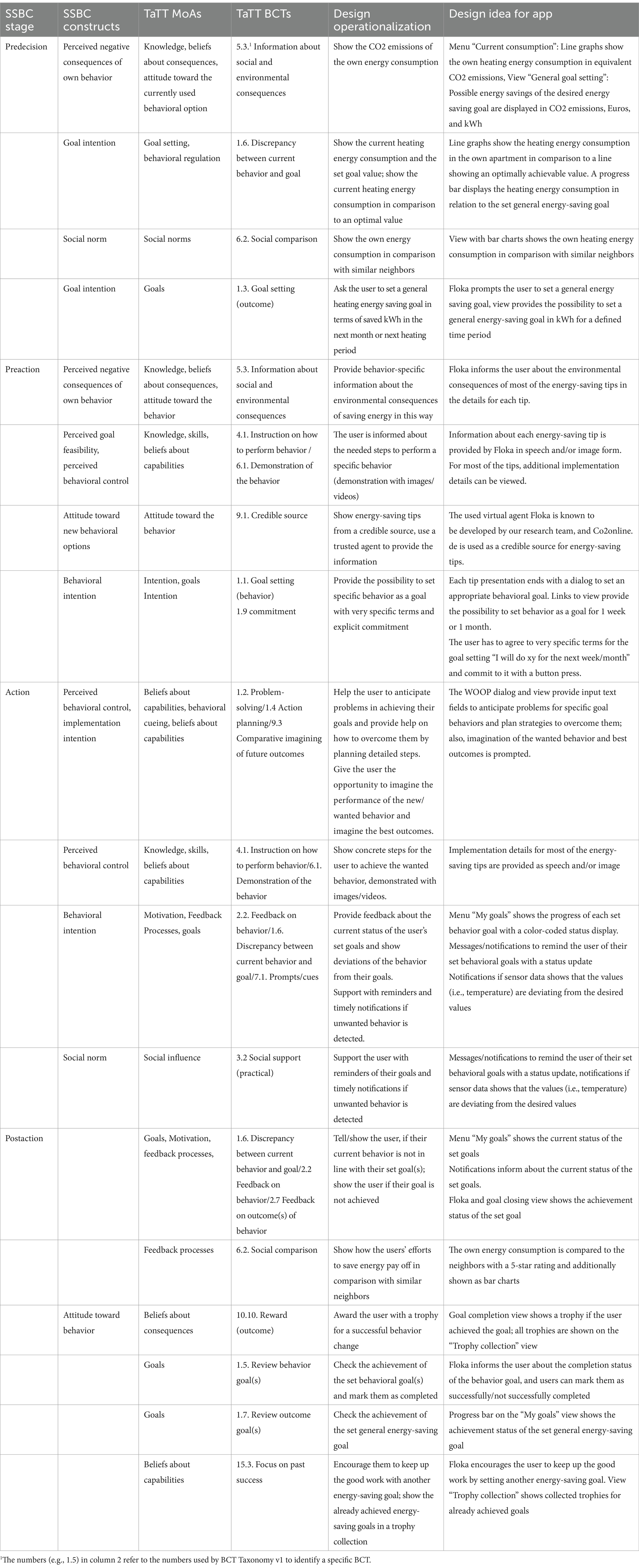 For applying the TaTT, in the first step, we have to translate the construct labels used by the SSBC into the more general MoA labels used by the TaTT. In the second step, for the SSBC constructs thus translated into the TaTT “language,” we used the TaTT app to select MoA-BCT links. This selection process was steered by two criteria: the links should be supported by empirical evidence, and the BCTs should be potentially applicable within the context of developing an app for promoting heating energy-saving behaviors.