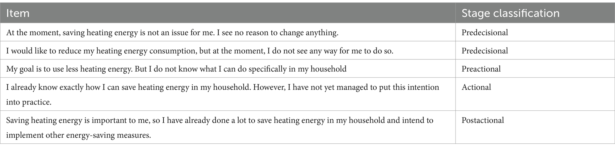 The measure for classifying participants’ stage membership was developed originally by Bamberg (2013) in the context of reducing car use. For the present study, this measure was adapted to the domain of heating energy saving. The measure consists of a forced-choice task asking participants to choose from the five statements presented in Table 3, the one that best describes their current heating behavior and their plans for the future. For example, participants who select item 1 or 2 are assigned to the predecisional stage.