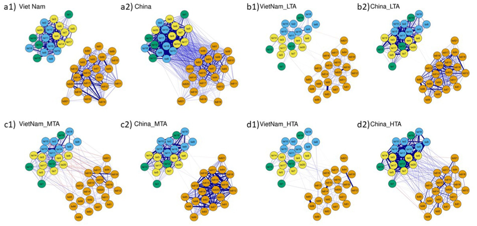 Figure 2 presents the visualization of the network models for the overall samples from China and Vietnam, as well as for each country’s subgroups. Each network contains 41 nodes, representing the 20 items from the Test Anxiety Inventory (TAI) and the 21 items from the Beck Depression Inventory-II (BDI-II). In the figure, blue lines indicate positive correlations, and red lines indicate negative correlations; the thicker the line is, the stronger the partial correlation.