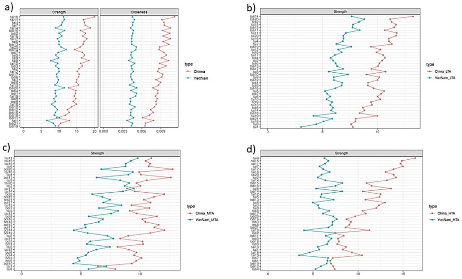 Network centrality indicators of test anxiety and depression based on latent profile categories among Chinese and Vietnamese undergraduates: full sample and three different profiles of test anxiety (TAI) and depression (BDI-II): (a) full sample, (b) low test anxiety (LTA), (c) middle test anxiety (MTA), and (d) high test anxiety (HTA).