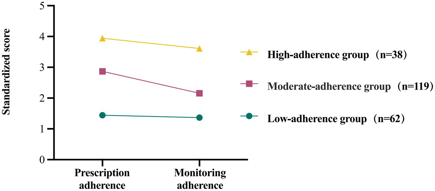 The two dimensions of the exercise rehabilitation adherence scale for patients with chronic heart failure, namely prescription adherence and monitoring adherence, served as the observational variables in fitting one to four latent profile models. These models were utilized to conduct a latent profile analysis of exercise adherence among CHF patients. The findings are detailed in Table 2. Compared to the two-profile model, the three-profile models demonstrated lower values for the AIC, BIC and aBIC, alongside higher entropy values. Consequently, the three-profile model was chosen for categorizing exercise adherence behaviors within this population. The probabilities of membership for each category were 28.3, 54.3, and 17.4%, respectively. In addition to model fit statistics, the average posterior probabilities for the most likely latent class membership were examined to assess classification quality. As shown in Table 3, the average posterior probabilities for the three identified profiles-low, high, and moderate exercise adherence-were 0.911, 0.930, and 0.906, respectively. These values exceed the recommended threshold of 0.70, indicating a high degree of classification certainty and supporting the reliability of the three-profile (Nagin, 2005; Stanley et al., 2016). The distinct categories were classified as low, moderate, and high exercise adherence groups based on their characteristics (Figure 2).